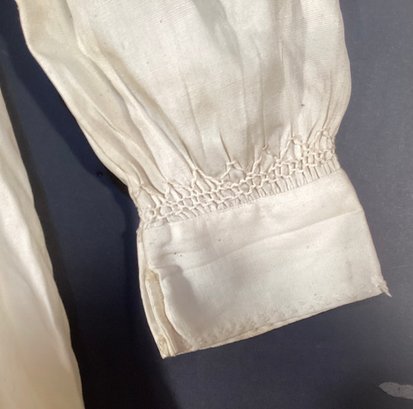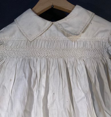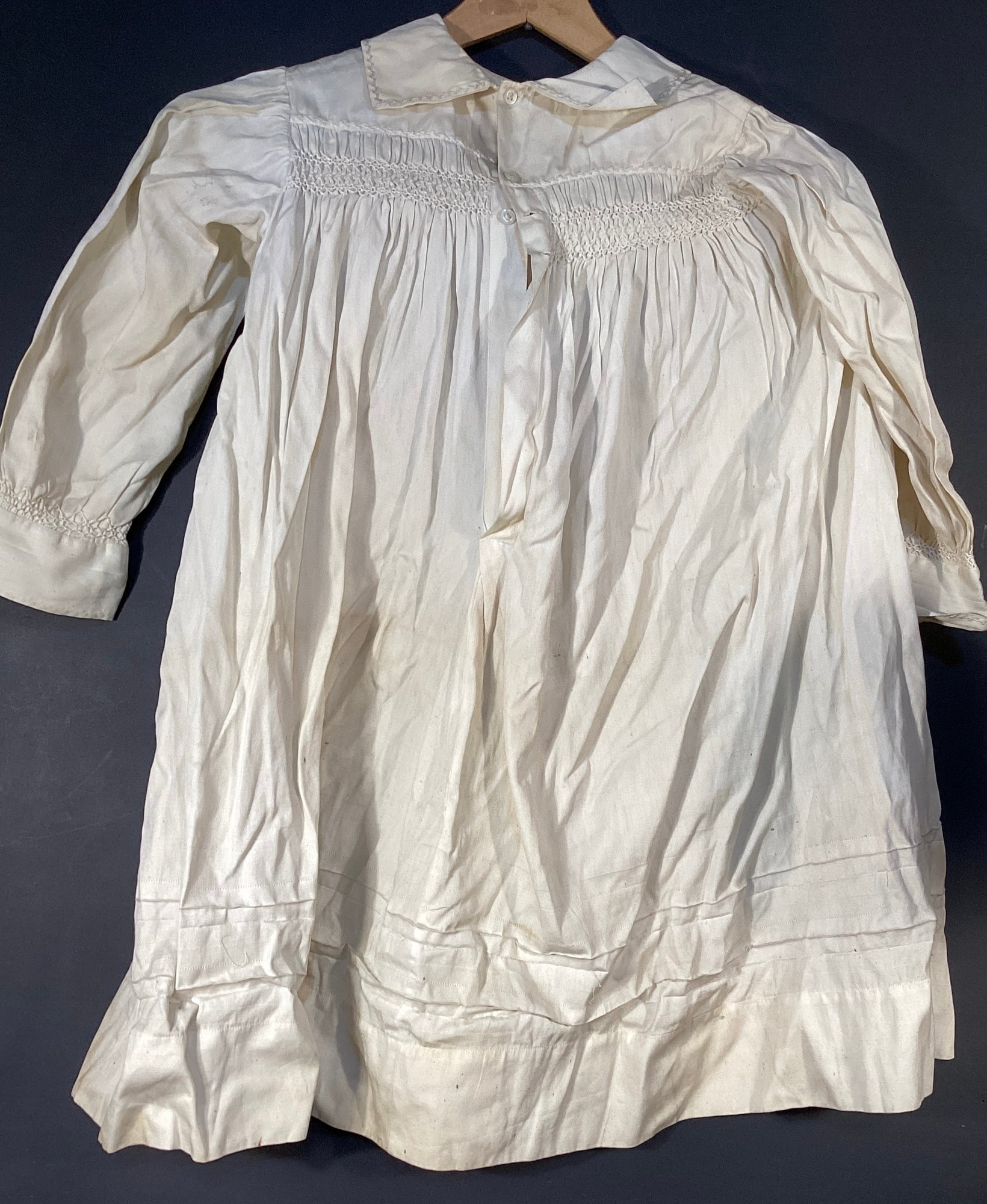Here we have a handmade child’s cotton dress with buttons on the back of the garment, and has smocked details on the front of the dress and cuffs.