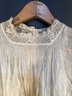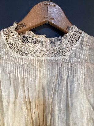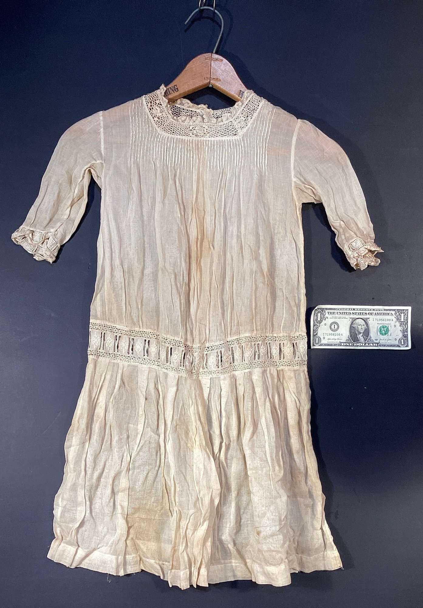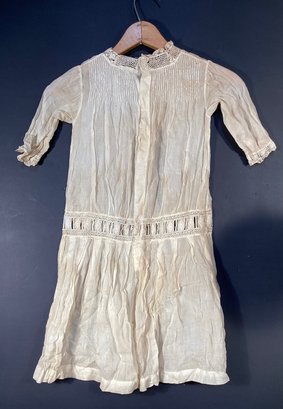 Here we have a handmade child’s fine cotton dress with buttons on the back of the garment, and has a tatted lace collar with other fine details on the drop waist and sleeves.
