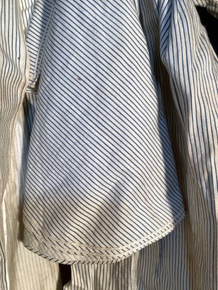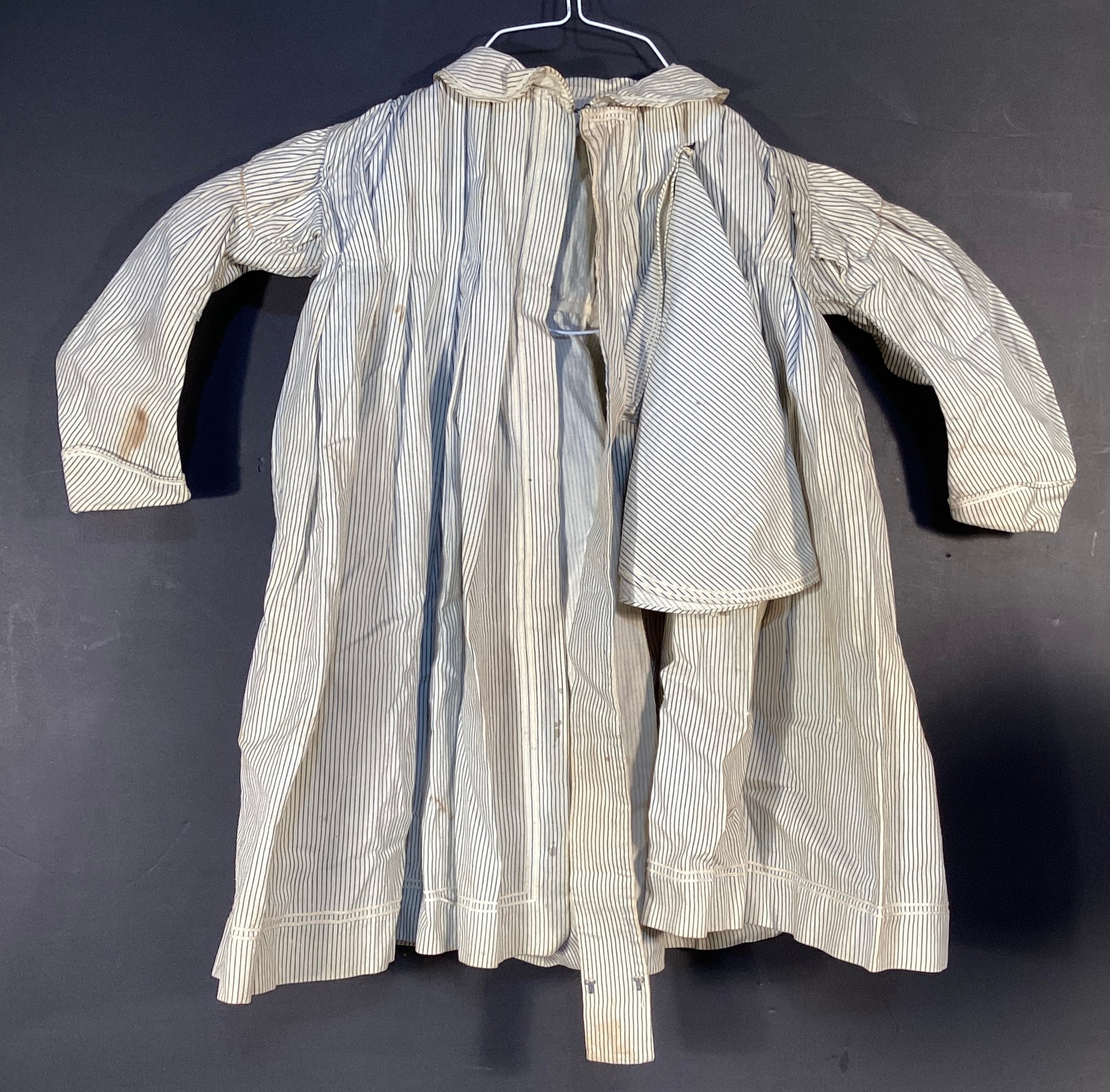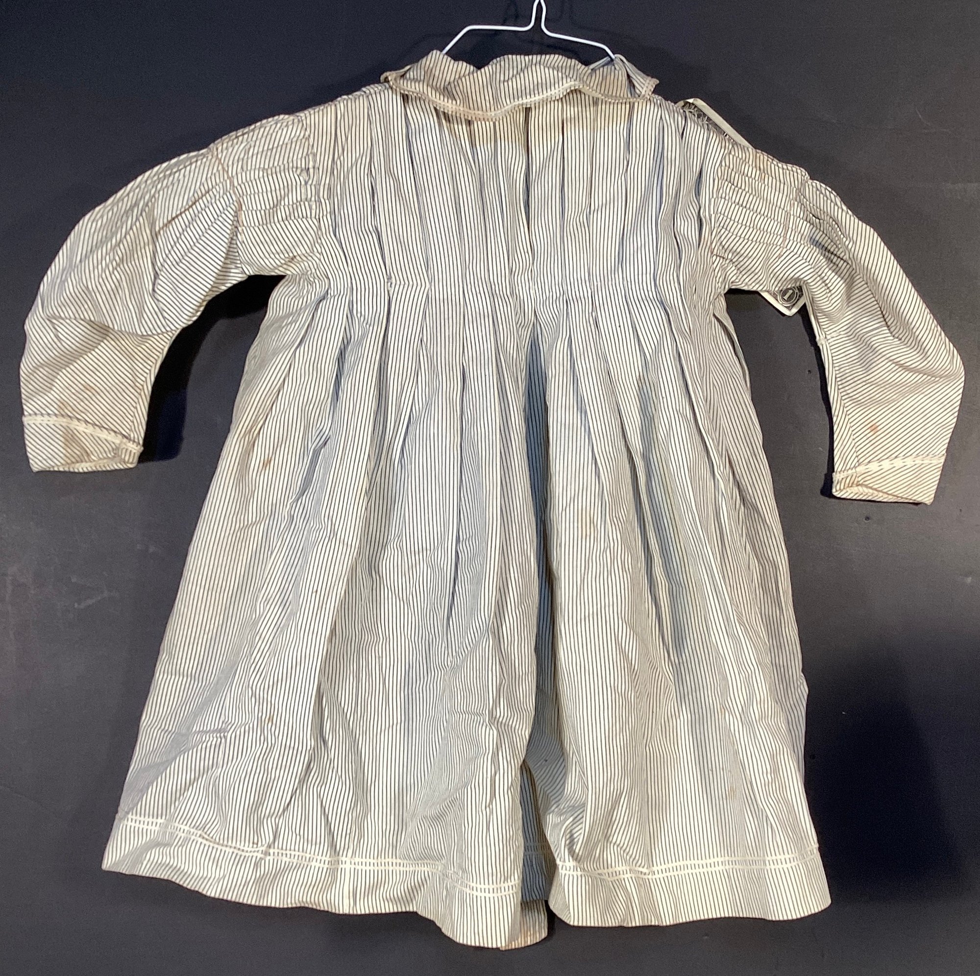 * this has been made of a durable cotton and appears to be hand sewn, with several small buttons on the back of this garment. This has a detachable collar which can be an overlay to this smock/dress.