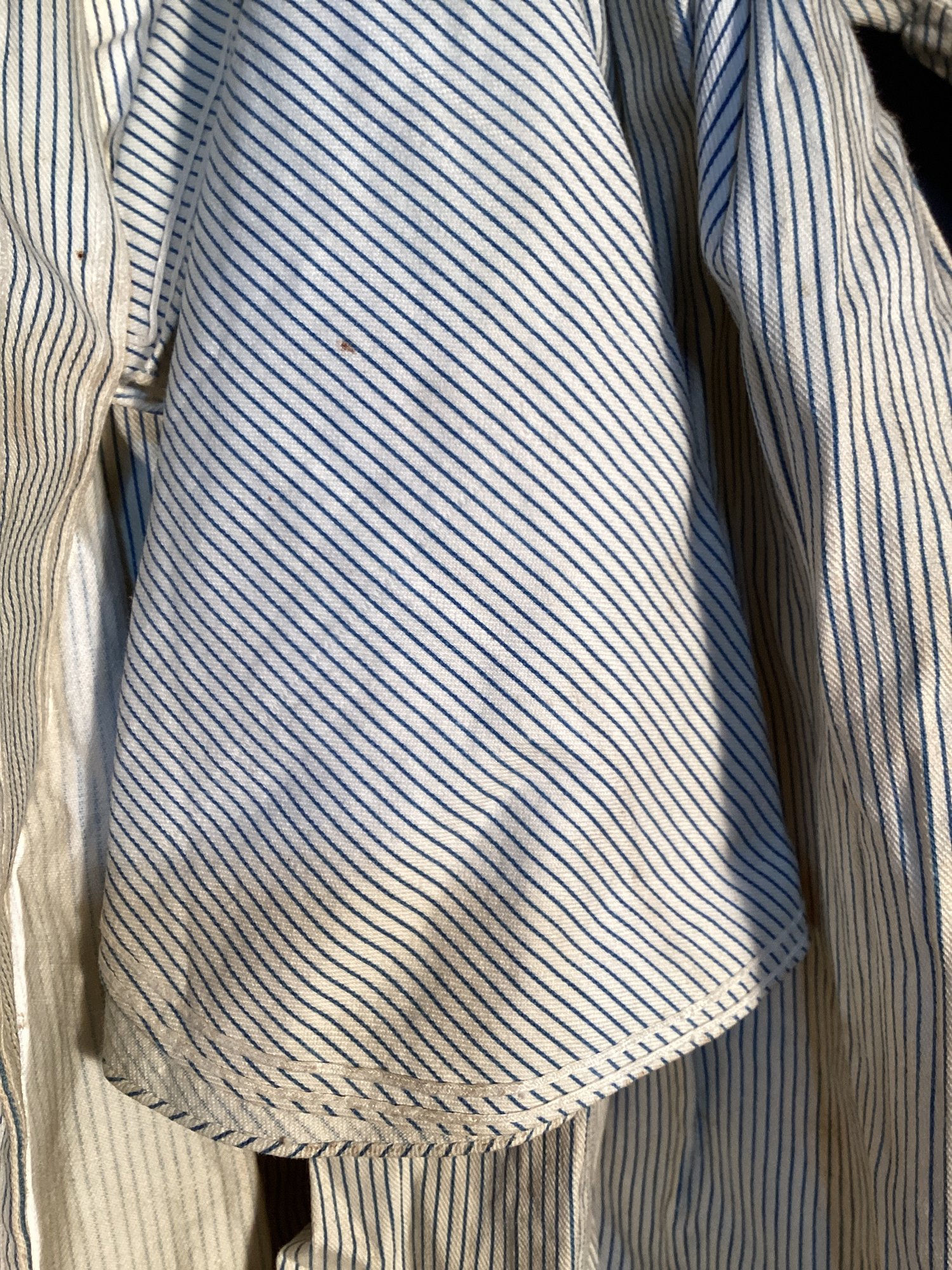 * the cotton twill has a neutral background with tiny blue stripes that run through the material.