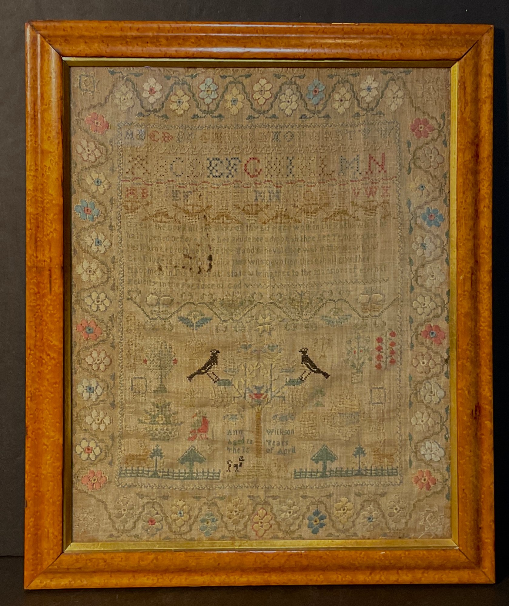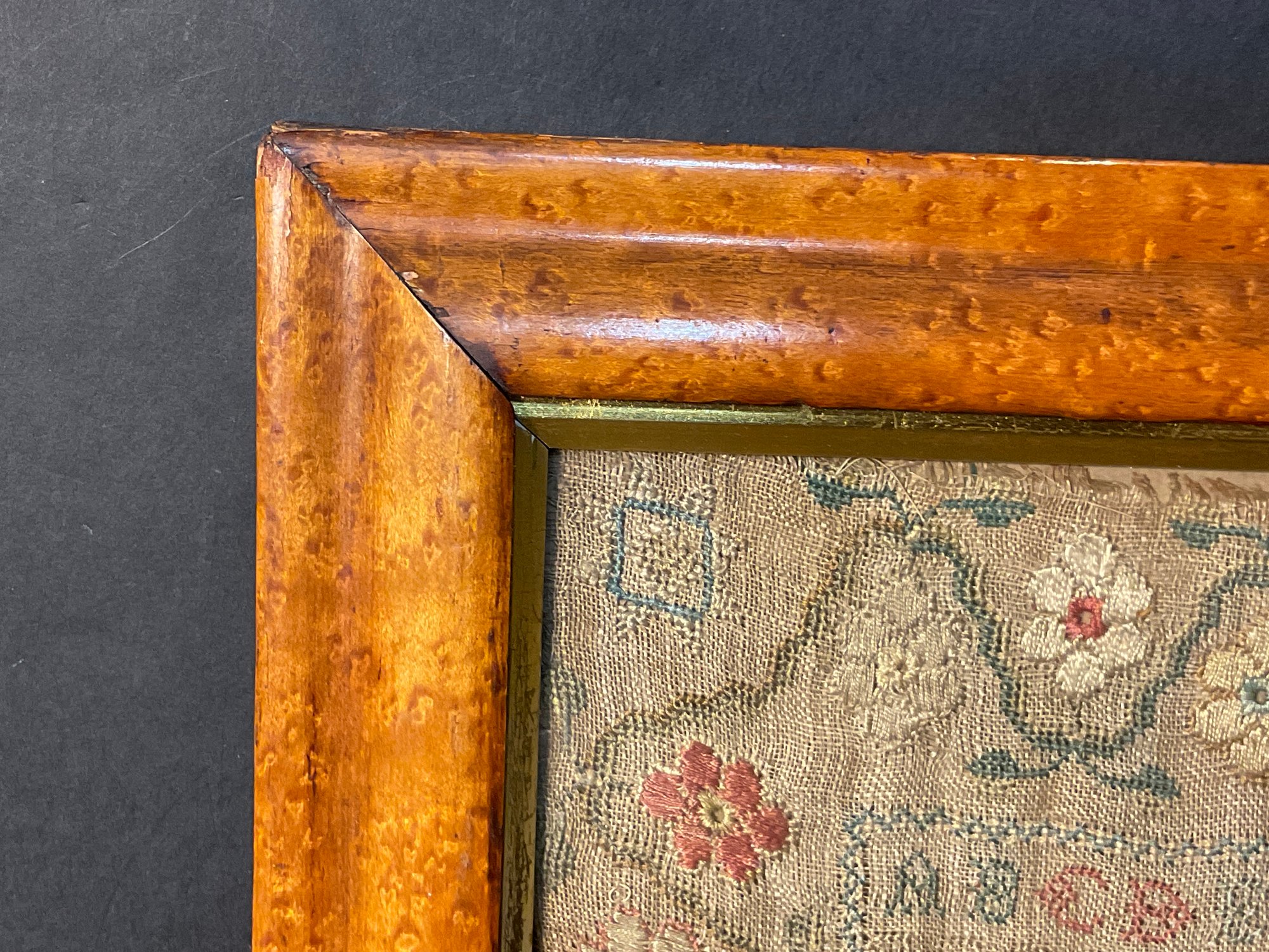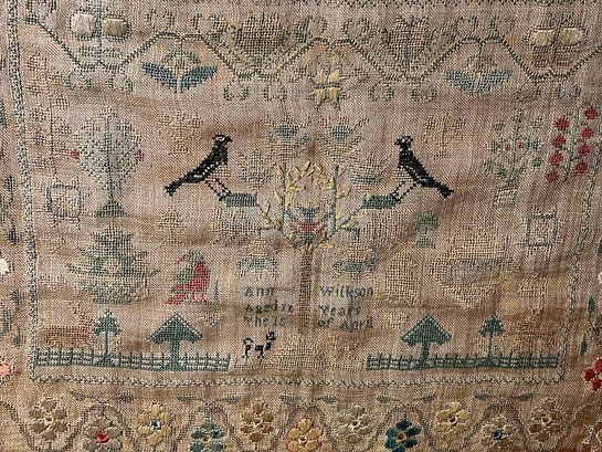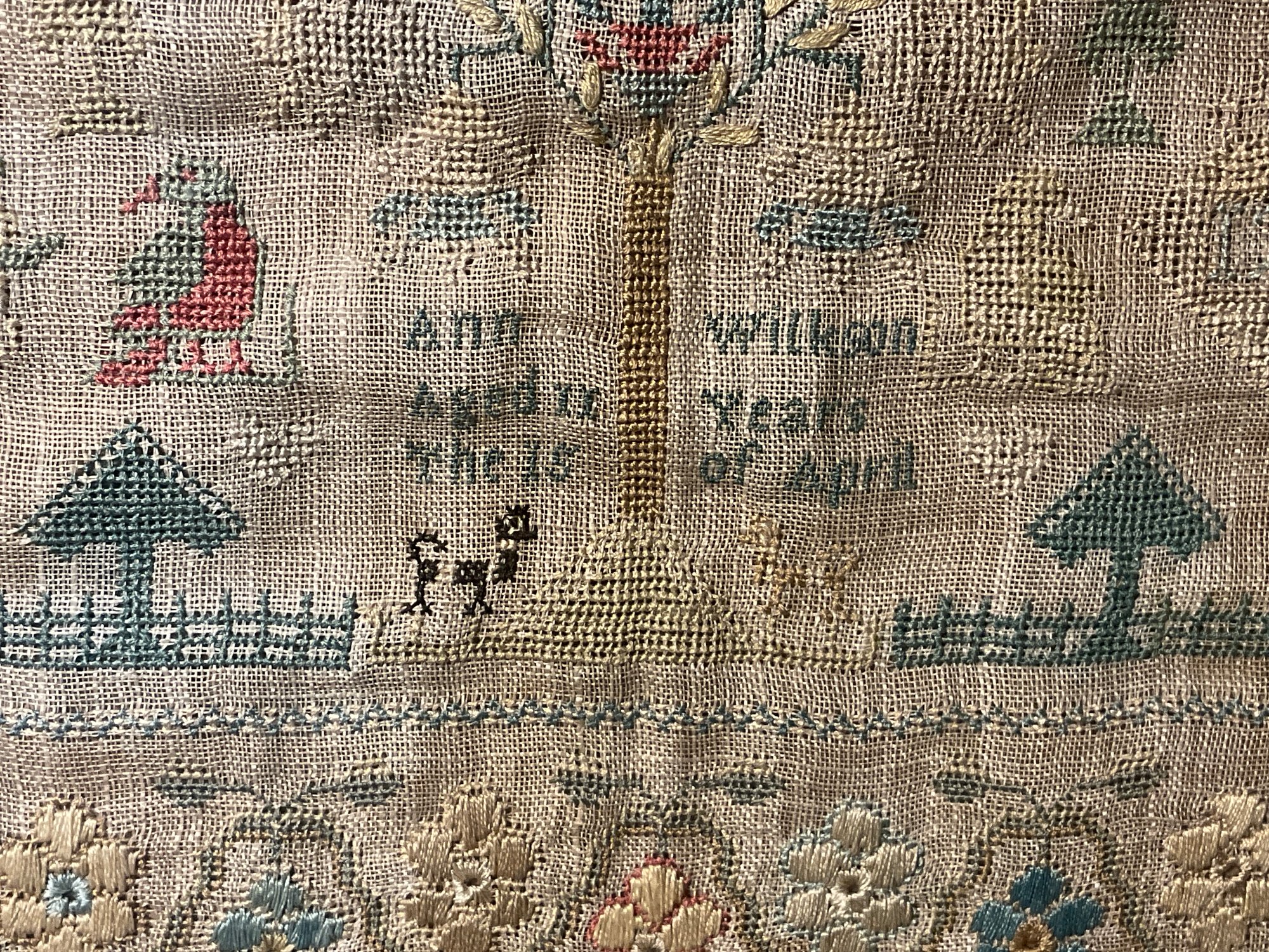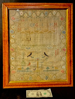 This American antique handmade linen sampler was made by Jane Sharples around the 1830s. Still retains good color and is framed in a nice rosewood frame. As you can see some of the information is missing Iām sure with very close inspection you could fill in the blanks and add a little bit of yarn to fix it completely.