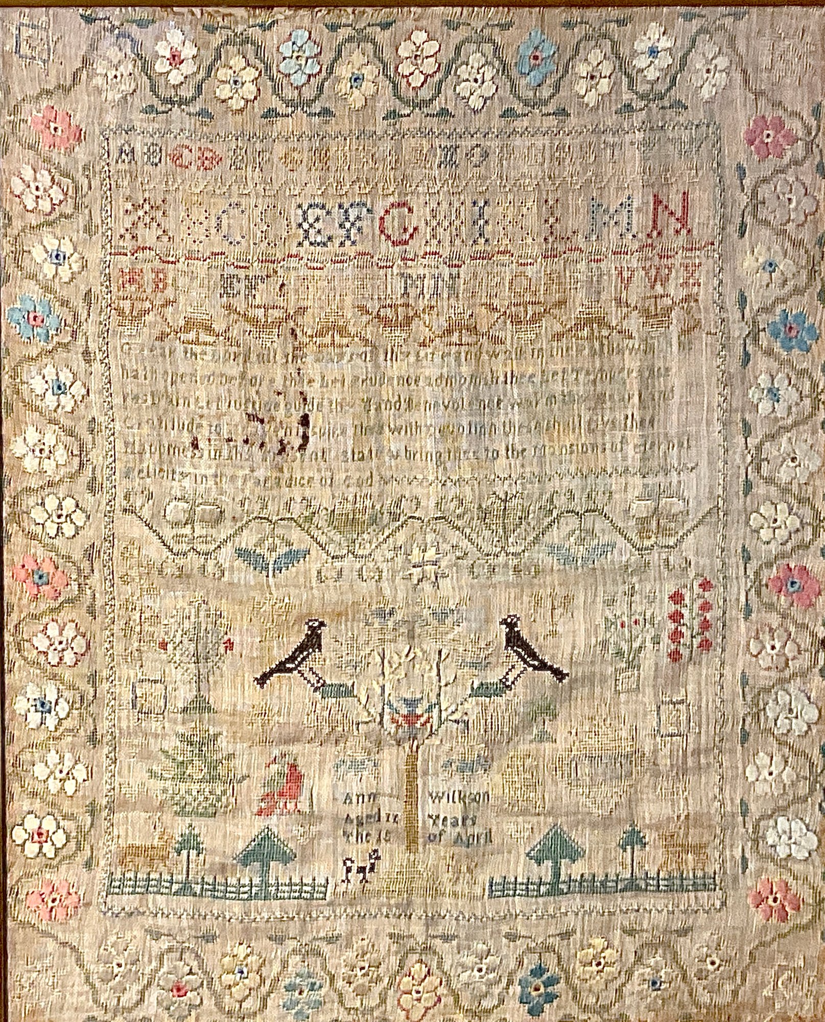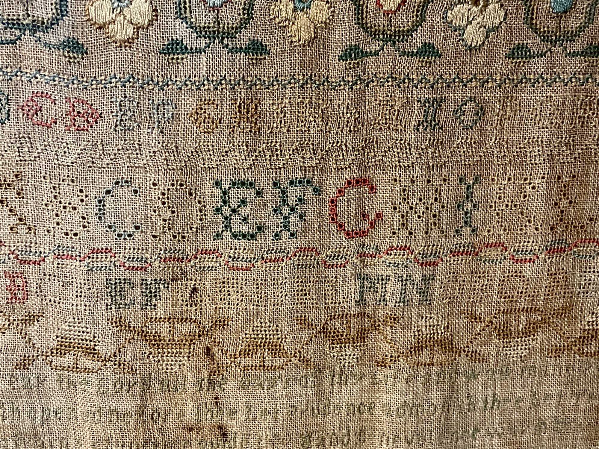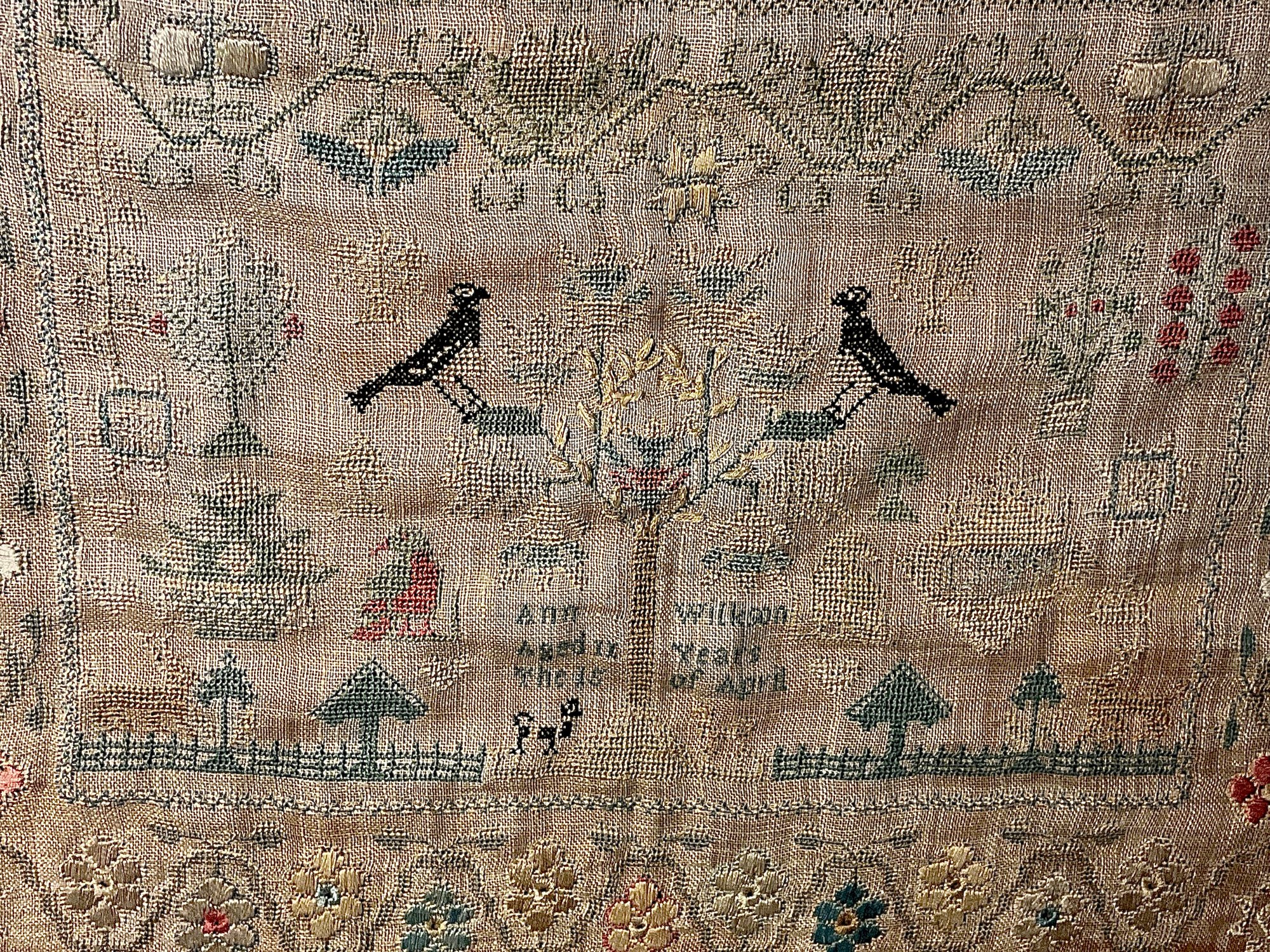 This American antique handmade linen sampler was made by Jane Sharples around the 1830s. Still retains good color and is framed in a nice rosewood frame. As you can see some of the information is missing Iām sure with very close inspection you could fill in the blanks and add a little bit of yarn to fix it completely.