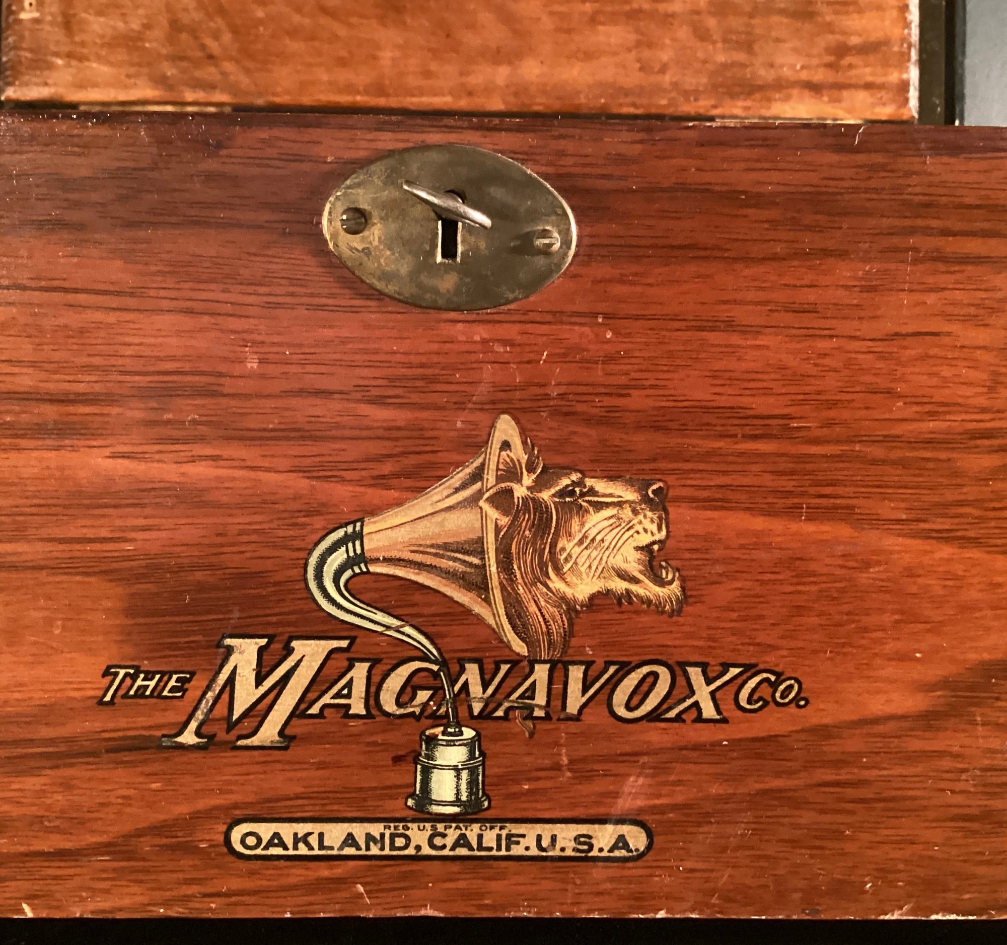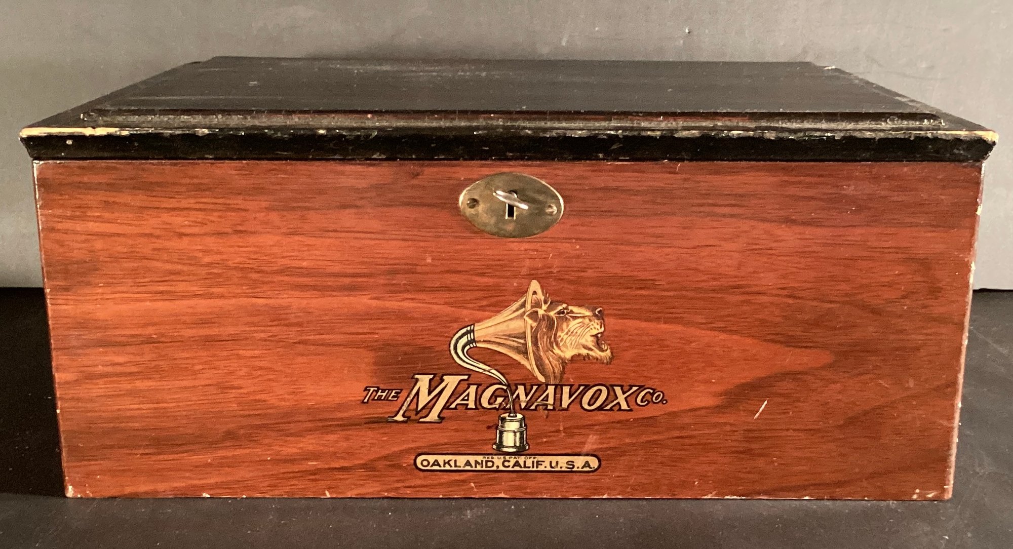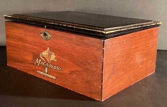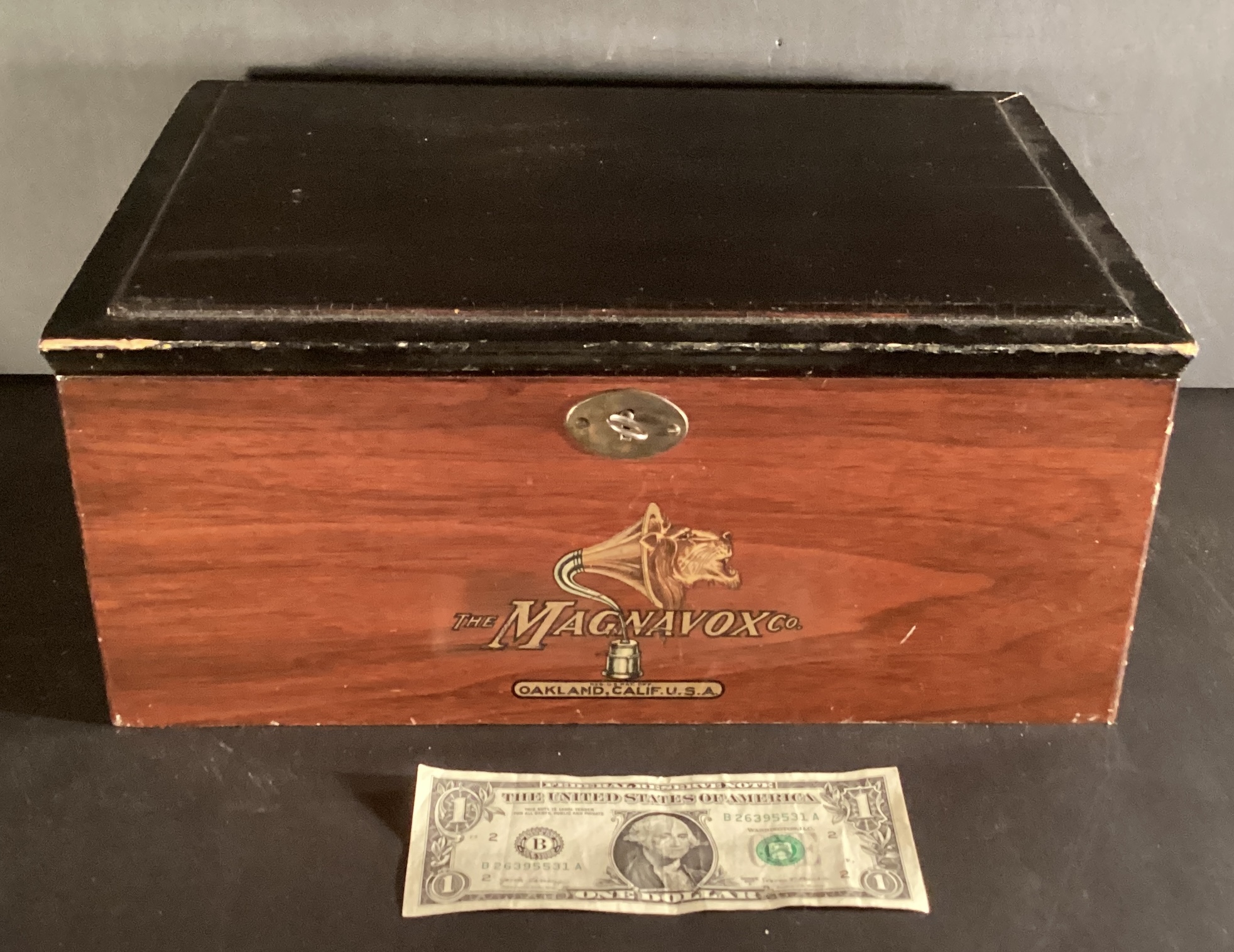 Very nice antique Magnavox mahogany advertising storage box with key. Magnavox logo on the front panel. Magnavox Oakland, California.
