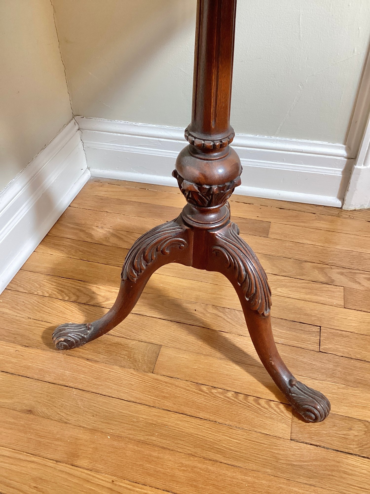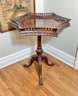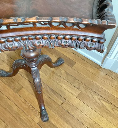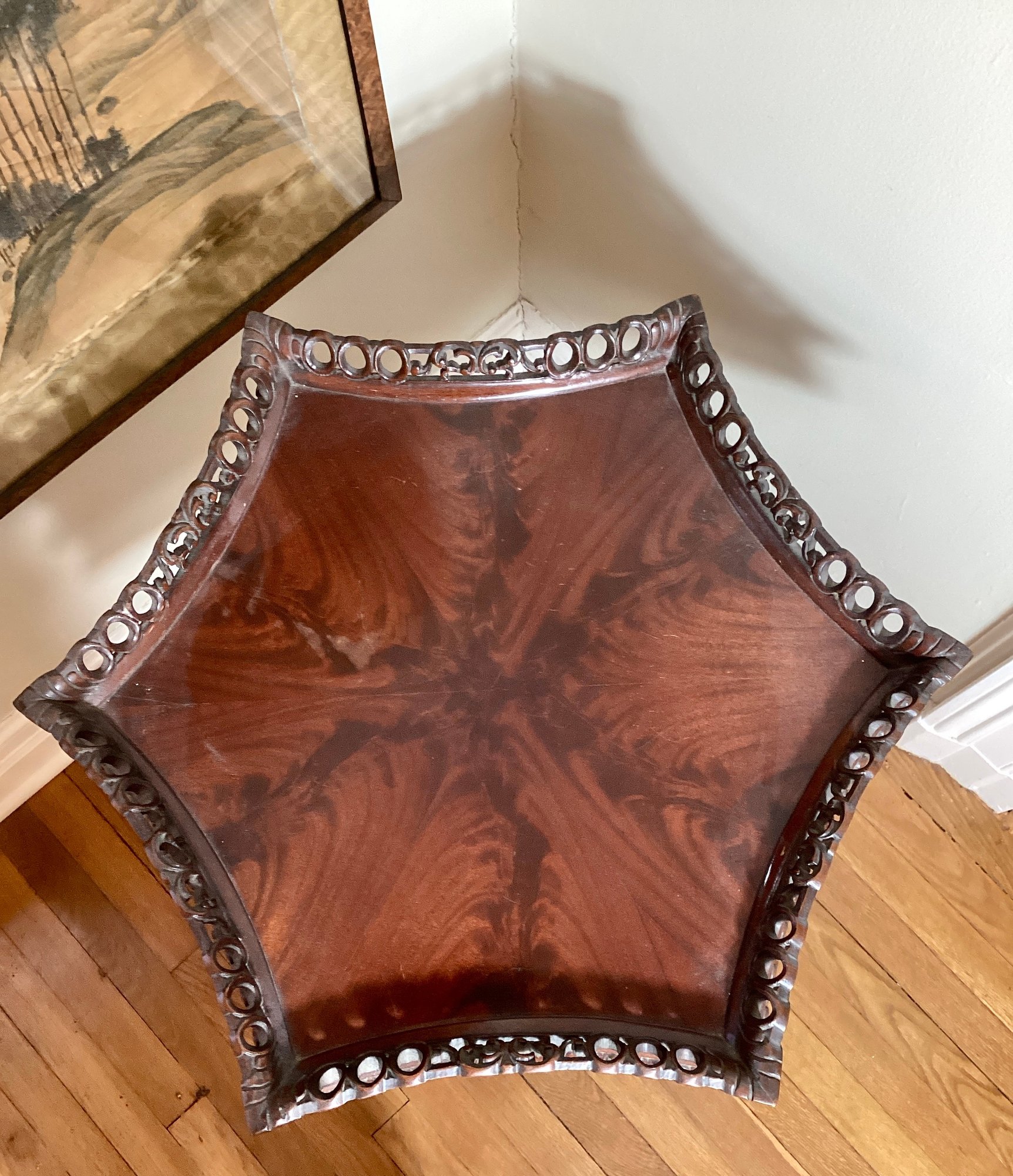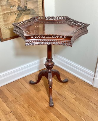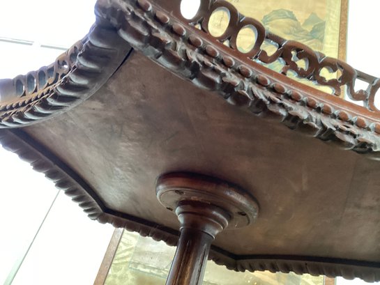 This table is very unusual because of the shape of the top. Tables like this were occasionally pulled up to the dining table and for presenting wine. Very interesting shape and in very good condition. Fancy mahogany quality carving.