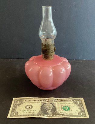 This oil lamp has a rose pink glass base that is in perfect condition. This has the original oil lamp fixtures, along with a tiny hand blown glass chimney, which fits snuggly onto the oil lamp.