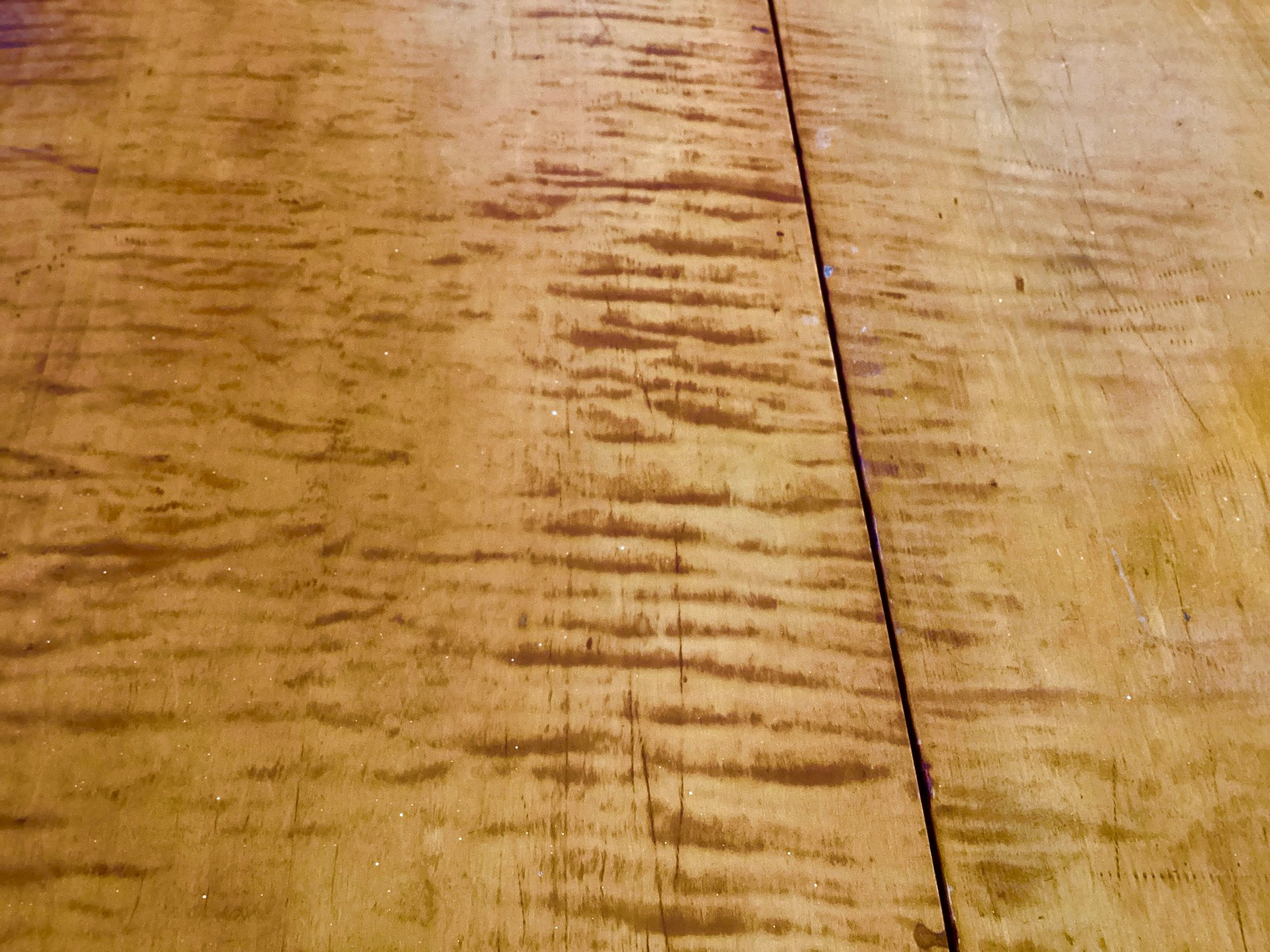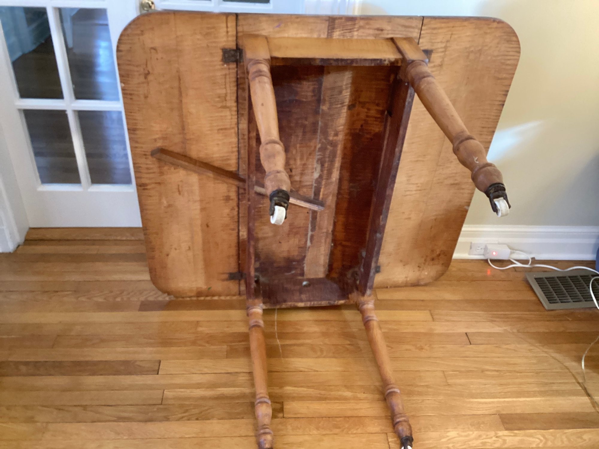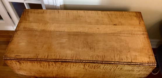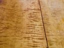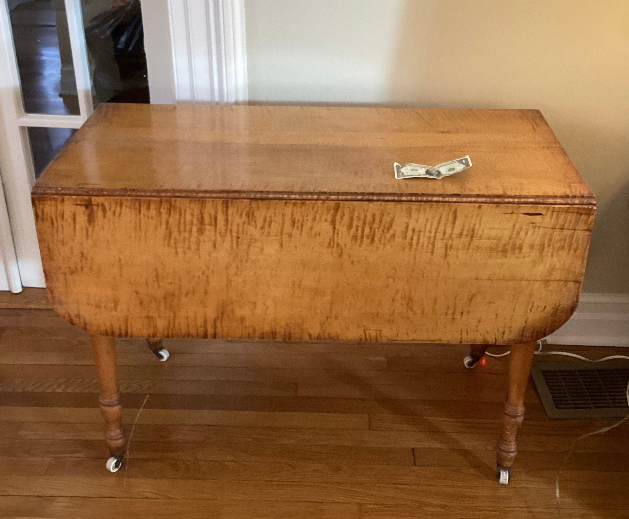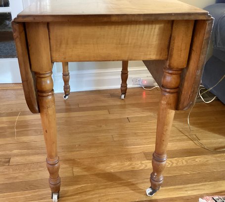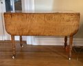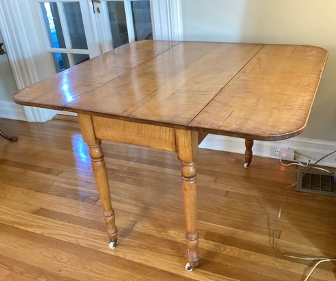 This is an American antique Tiger maple drop leaf table in a generous size. The turned legs are very graceful and are terminated in porcelain casters.