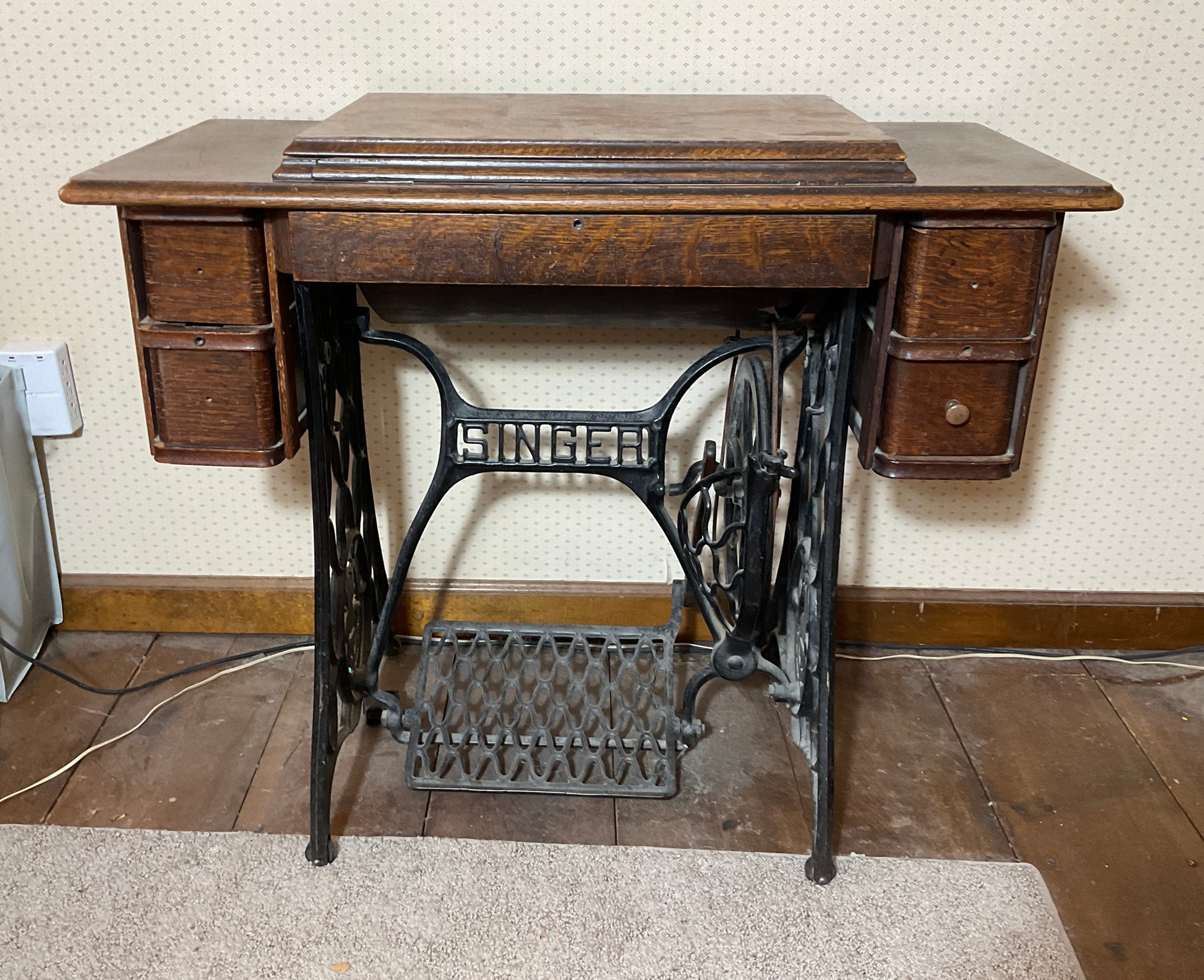 There’s a very nice antique oak sewing machine made by the singer manufacturing company. It still has the original sewing machine inside and will run just press down on the treadle and it will go. The finishes original and very usable.