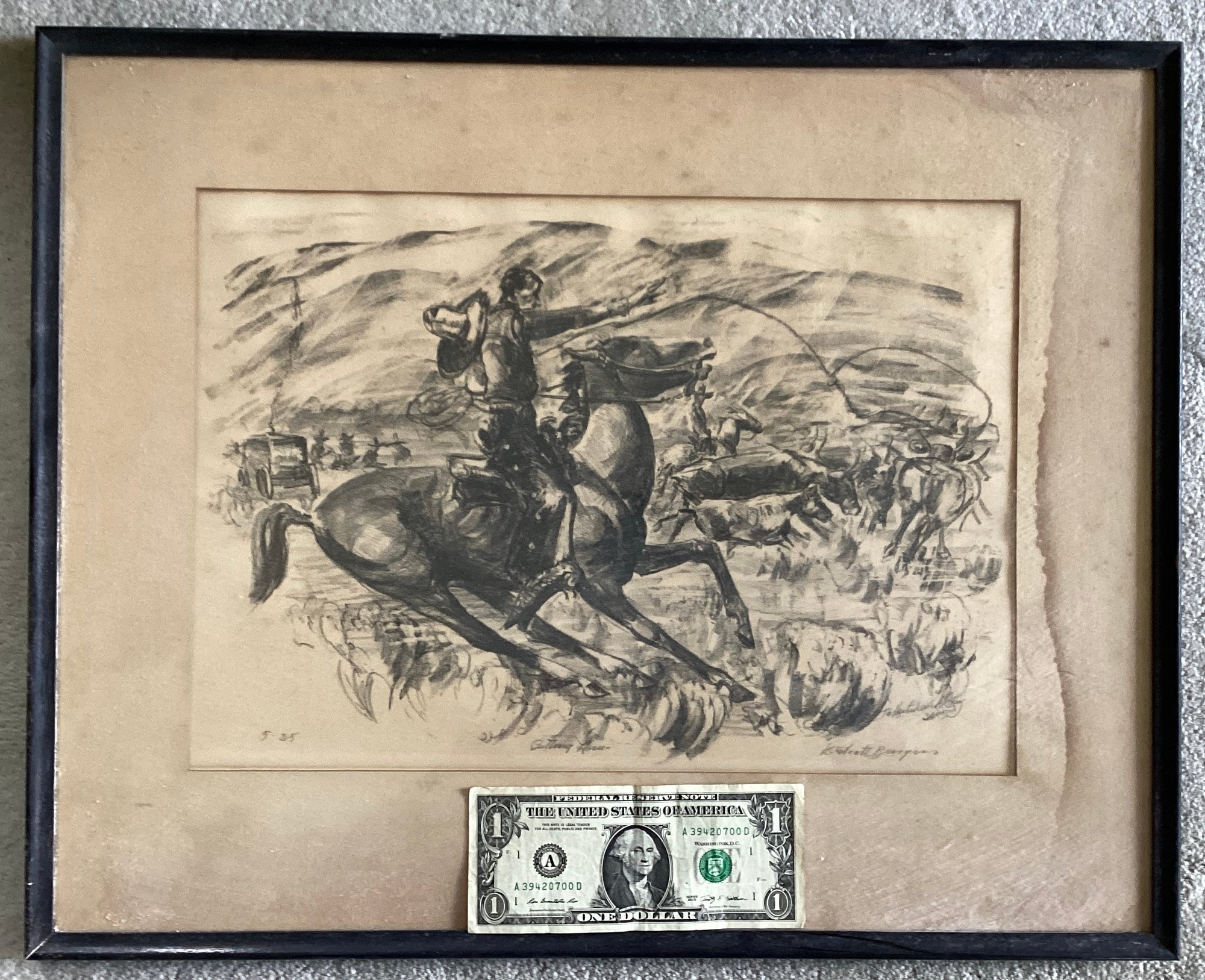 It is dated May of 1925 by the artist K. Burgess and it gives the flowing movement of a horse slowing down while the horse, the cowboy and others are herding cattle.