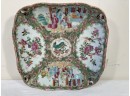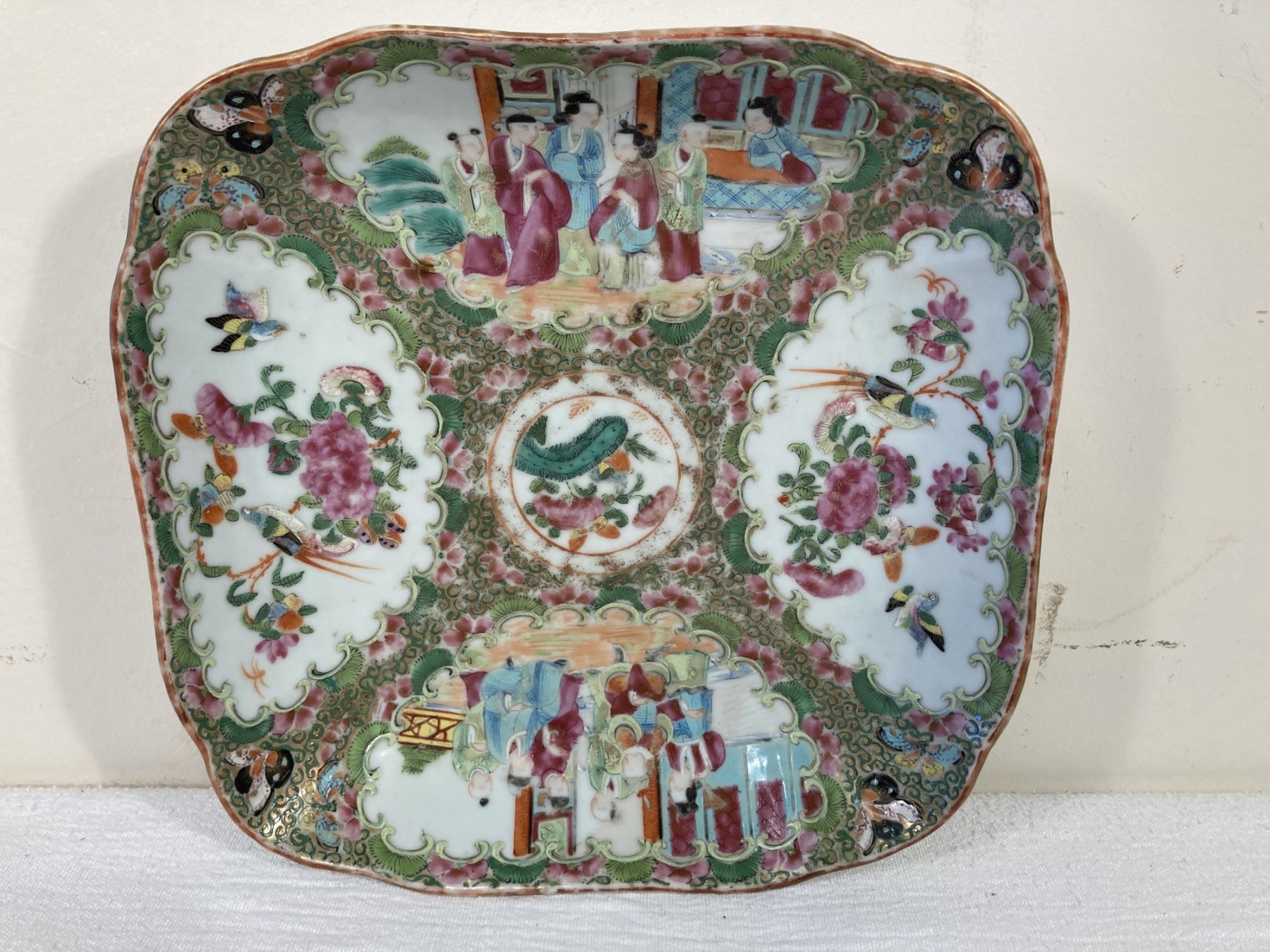 Selling a 19th century antique Chinese rose medallion square serving bowl with scalloped edge. Nice heavy enamel paint.