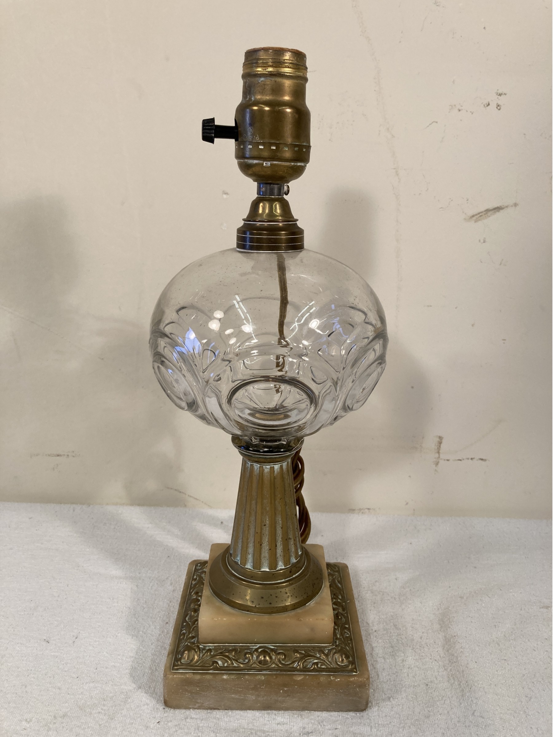 Selling a nice antique sandwich glass whale oil lamp with a marble and brass base. A stepped brass and marble base with a tapered fluted column, an eye shaped pattern glass. Converted to modern lamp.