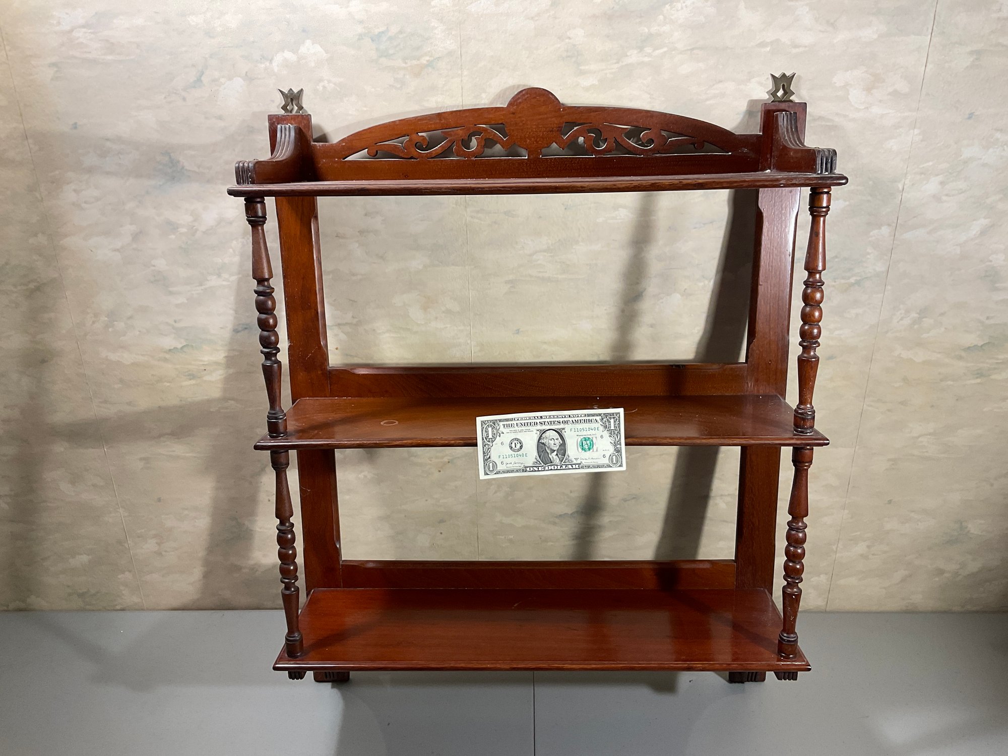 we have here a refinished solid walnut Victorian hanging shelf with a carved crest and interesting side columns. Very pleasing finish and good color all original and ready to use.