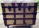 This trunk has wooden trim and has the cloth painted a soft yellow tone.