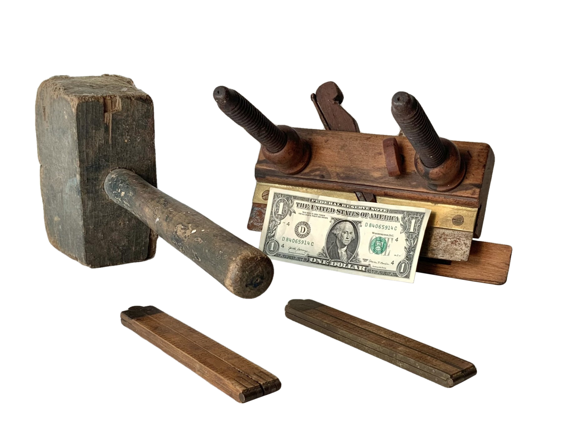 2 wood and brass folding rulers Stanley # 61 & 63 extend to 24”, oak Mallet that measures 13”, and a brass and wood 8 1/2” x 5” moulding plane signed C.H. Mayo