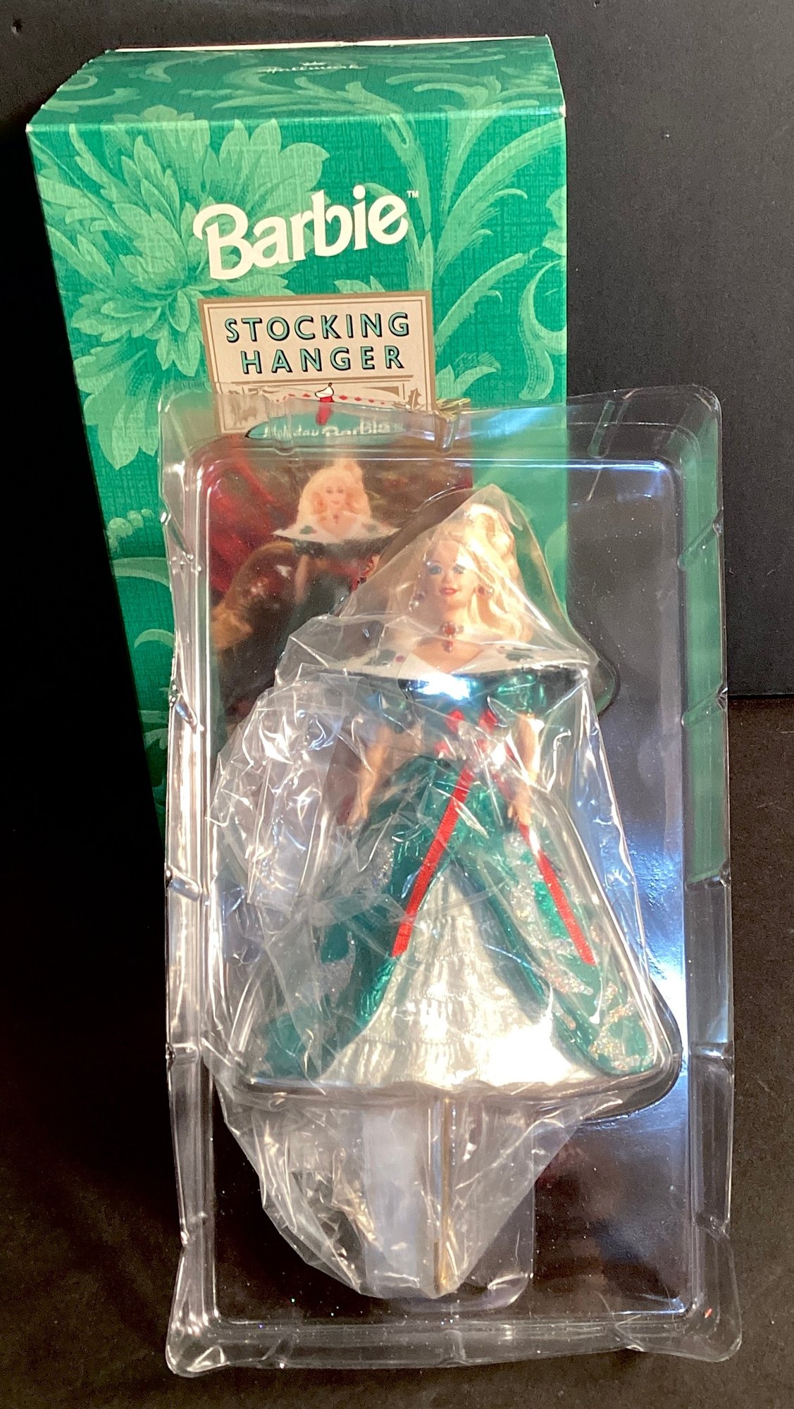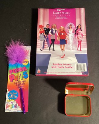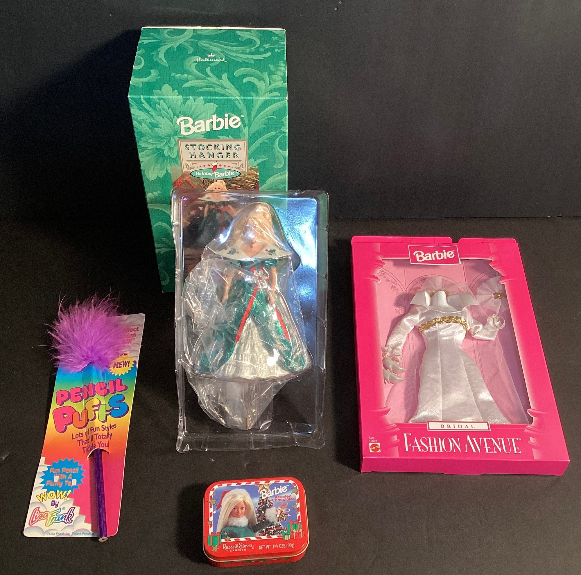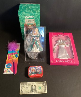 Here we have a Barbie new in box stocking hanger for Santa’s stocking, an outfit(new in box, a fashion pencil, and an empty Barbie tin.