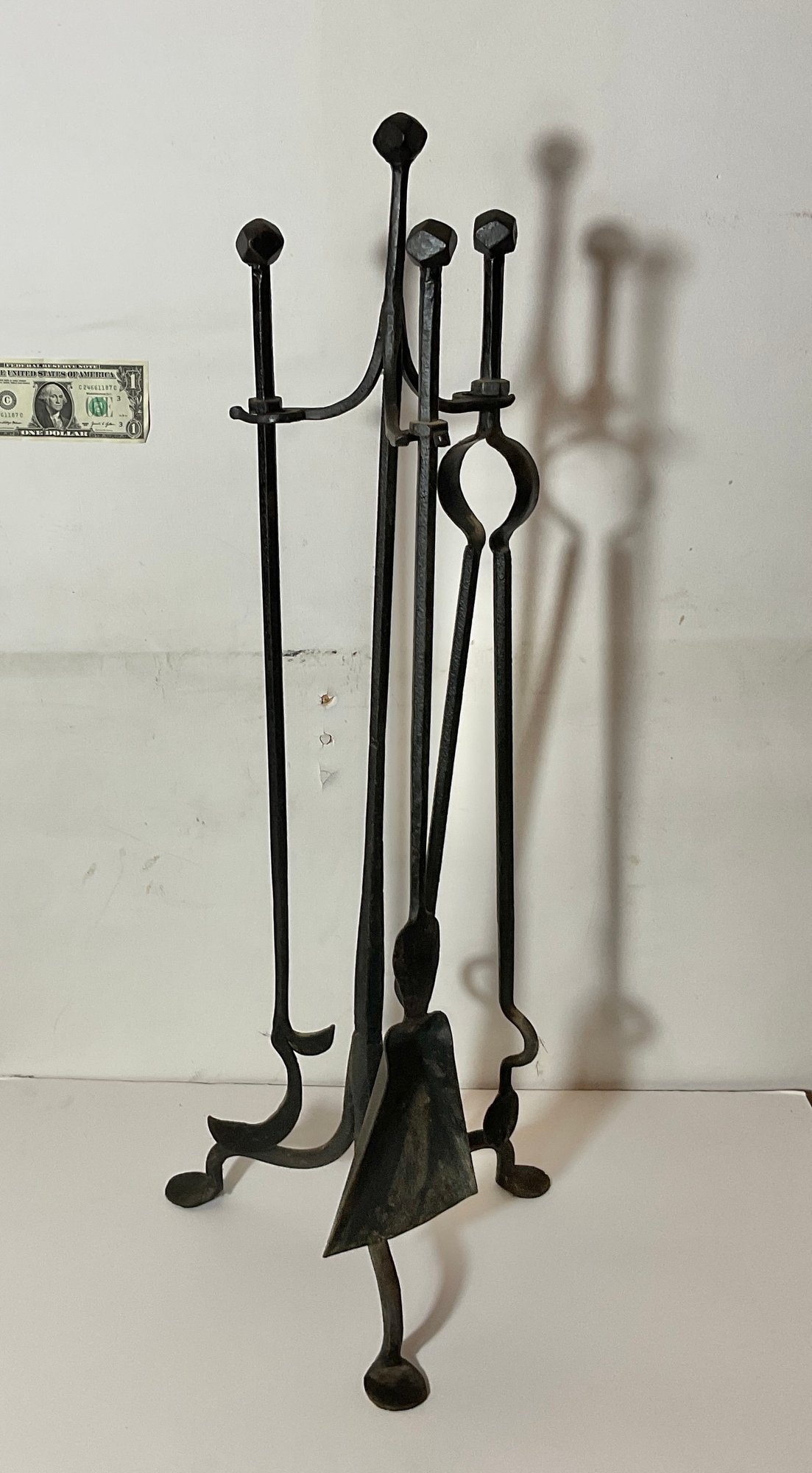 This is a magnificent scent of hand, rot blacksmith made fireplace tools with the stand. Very good quality very heavy hand hammered the stand has large penny feet and the workmanship is quite incredible. This is a special set.