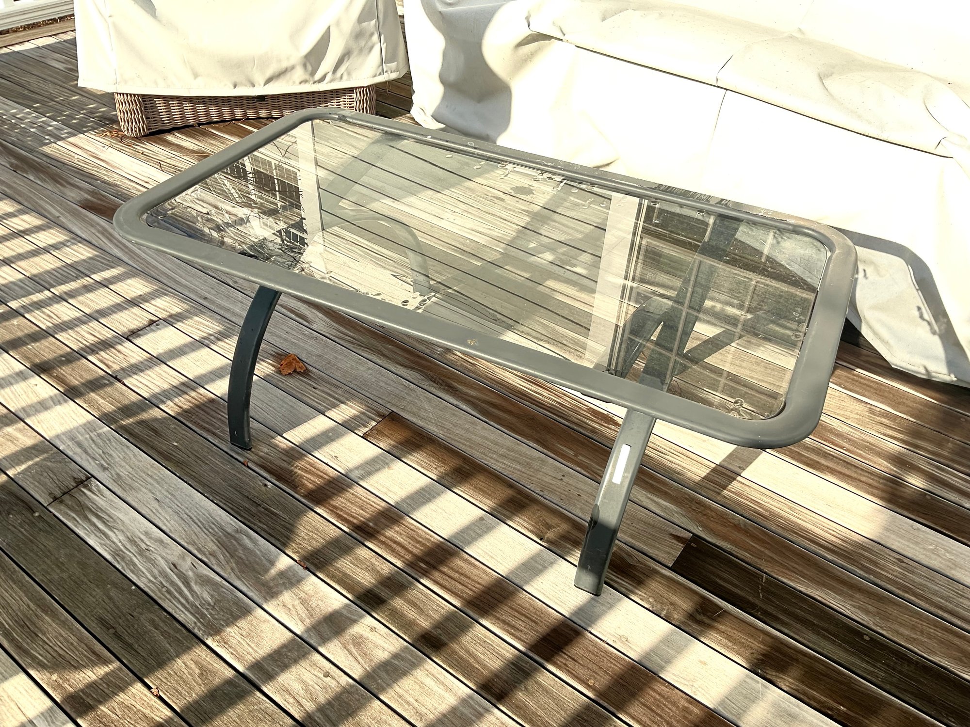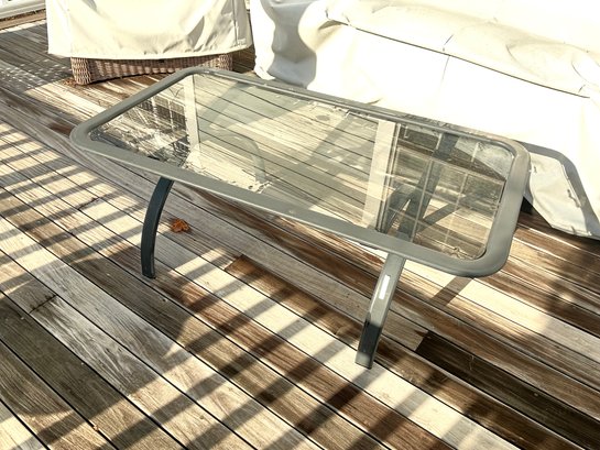 This is a nice stylish glass, top metal framed coffee table with a Brown Jordan label. Circa 1980’s. Some minor oxidation scrub able.