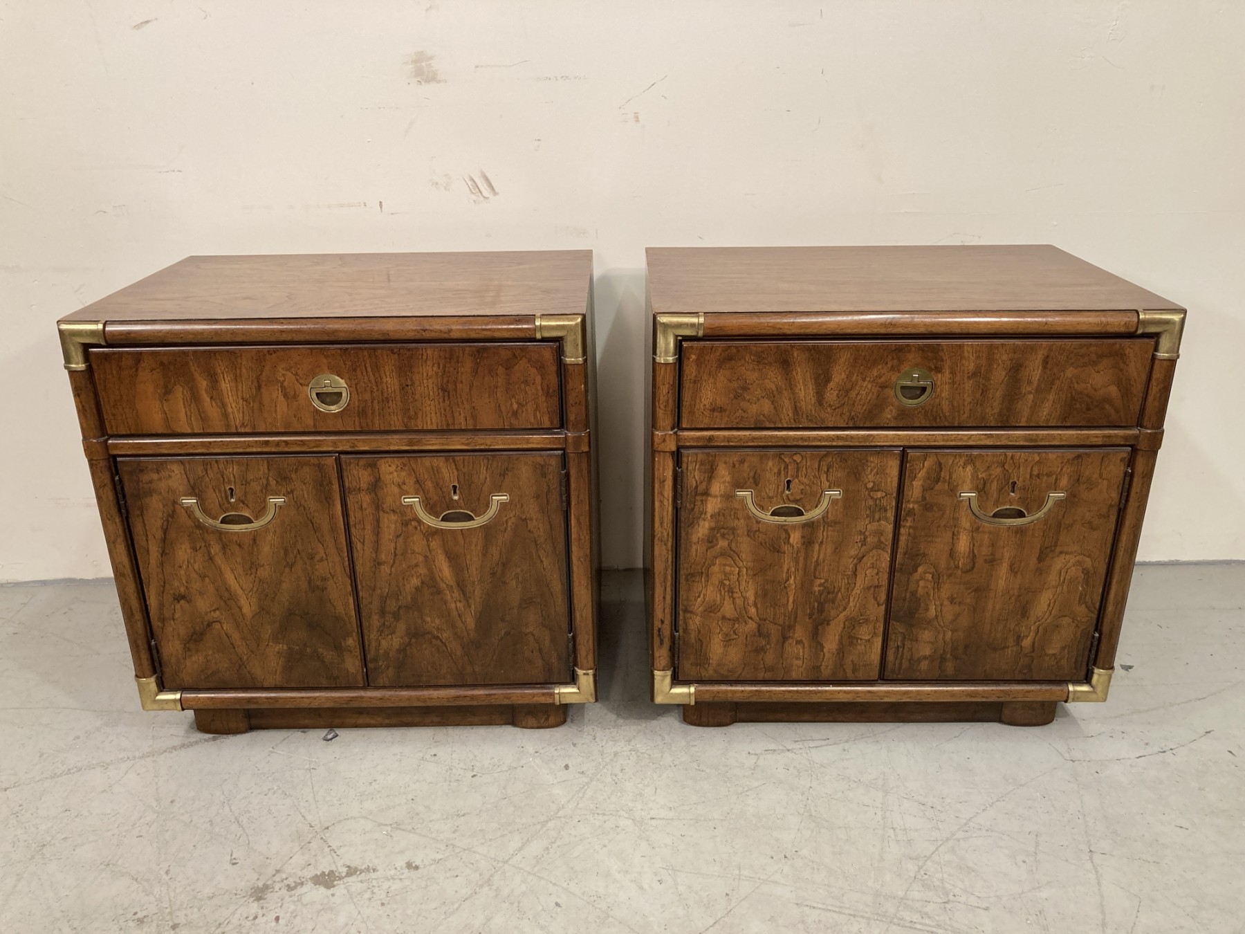 Selling a cool pair of campaign style Drexel accolade pecan wood matching nightstands with 1 drawer and 2 door storage below, accompanied by brass corners and hardware. C. 1970s.