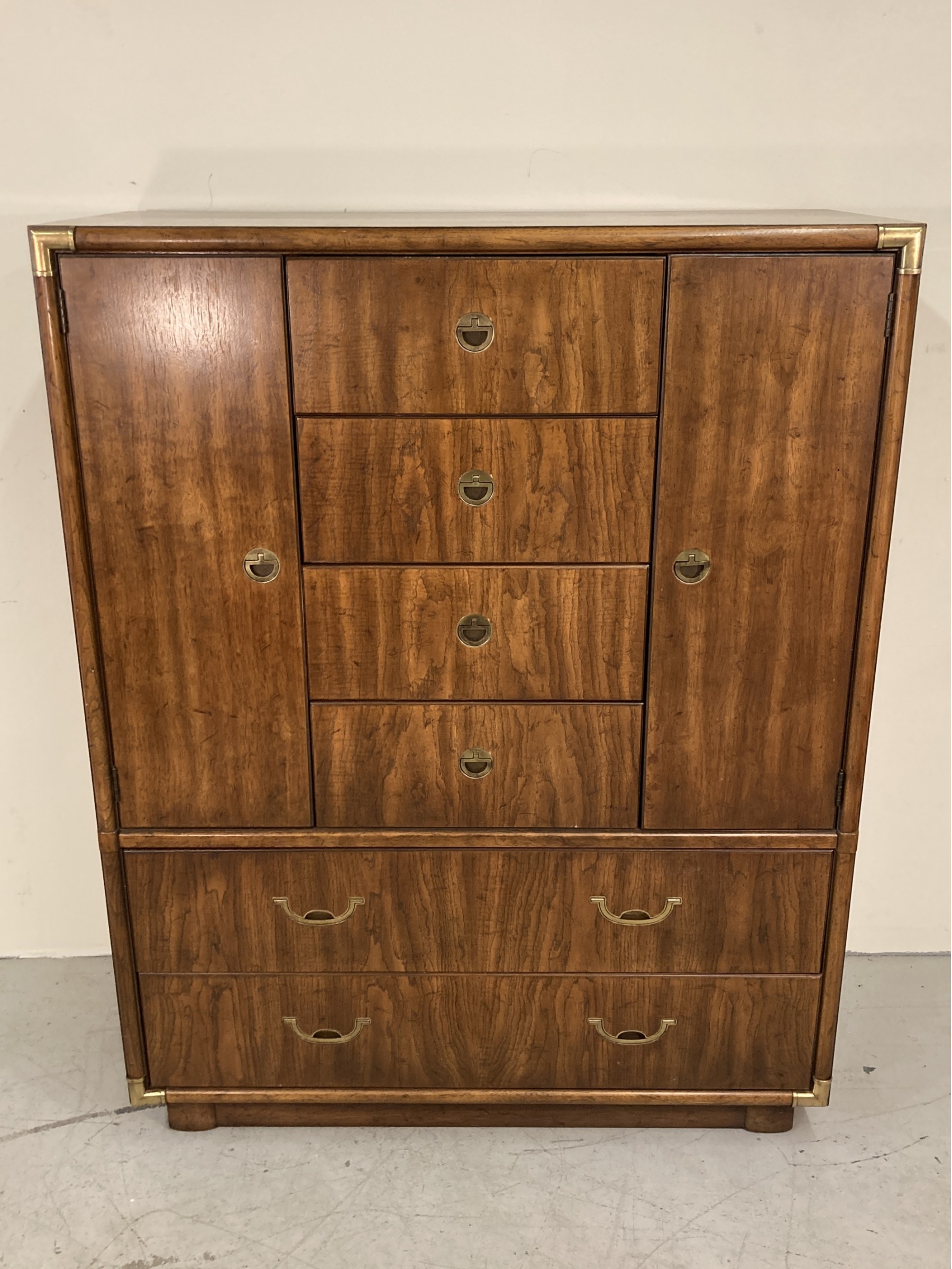 Selling a campaign style Drexel accolade line pecan wood tall chest with 6 drawers and 2 doors on the side. Lots of storage. C. 1970s.