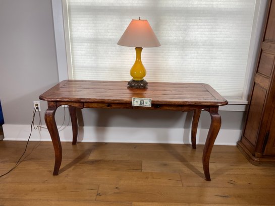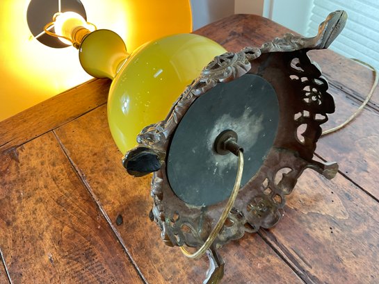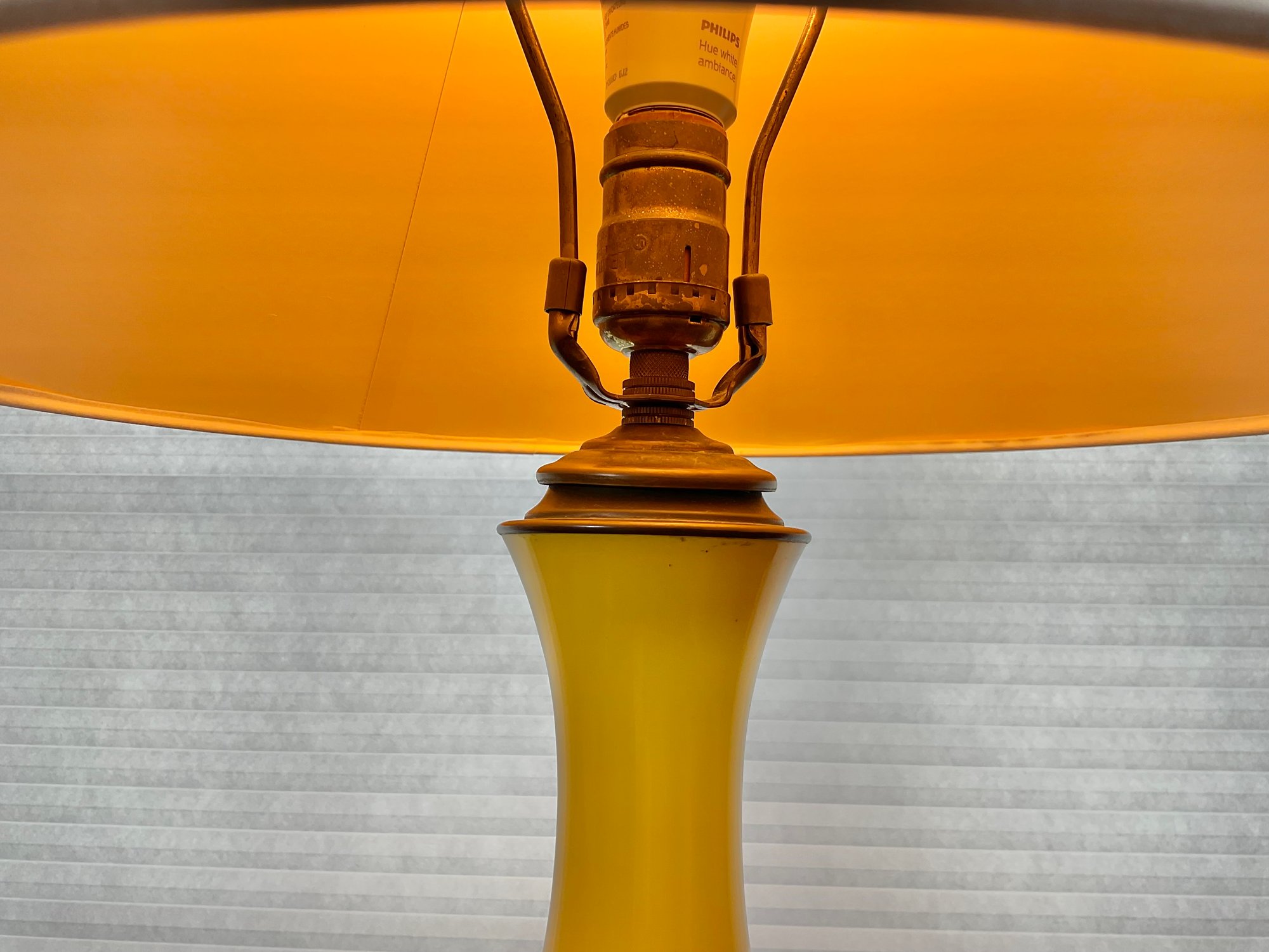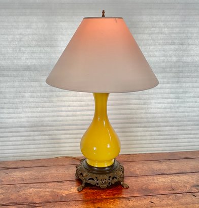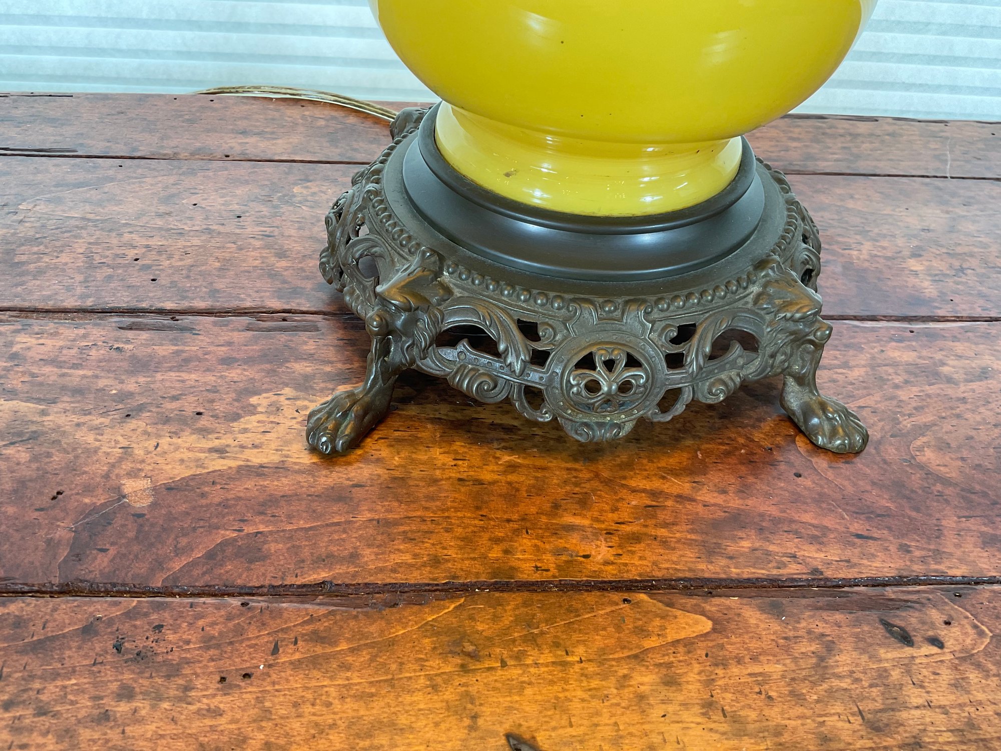This is a very nice older table in a wonderful yellow color and in very good working condition. The lions head brass base is very nice as well.