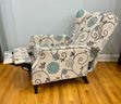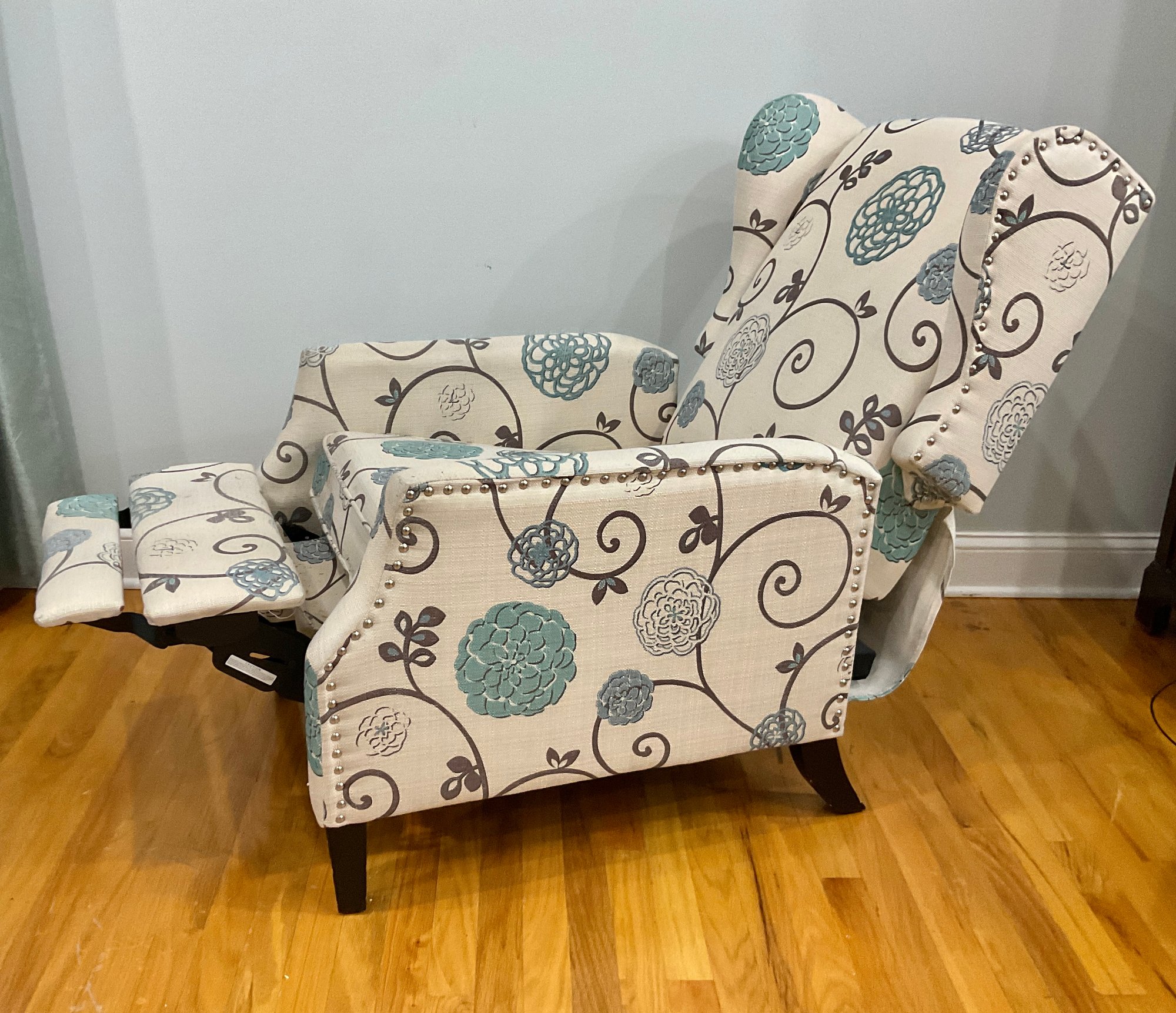 Good sturdy chair reclining back good enough to sleep in. Upholstery is a little tired but I think a little cleaner would take care of it.
