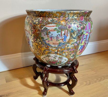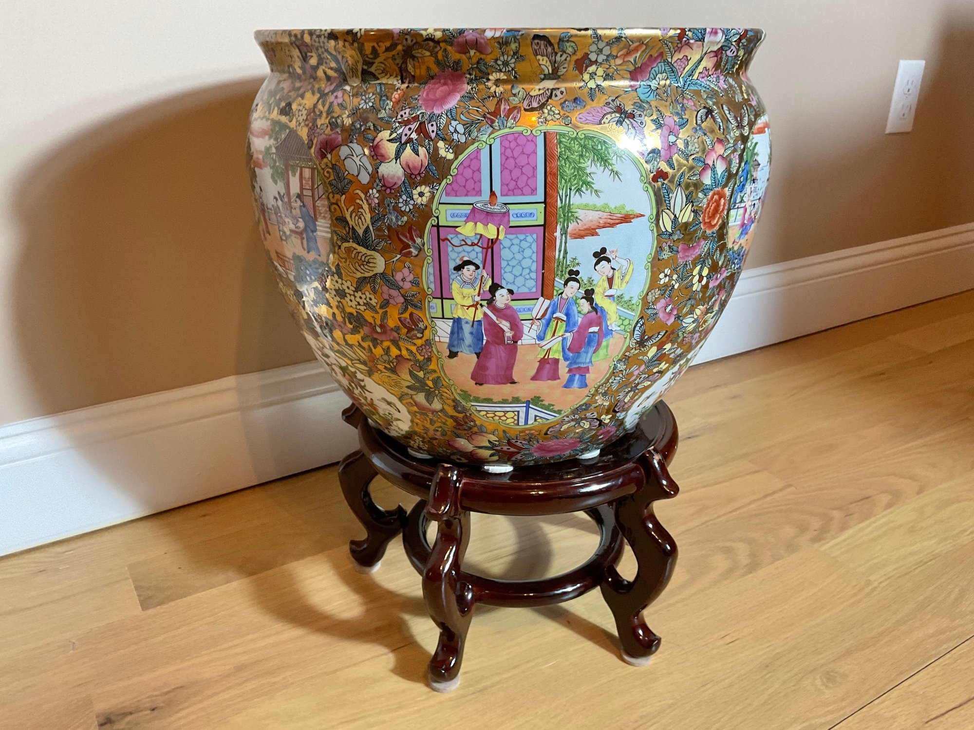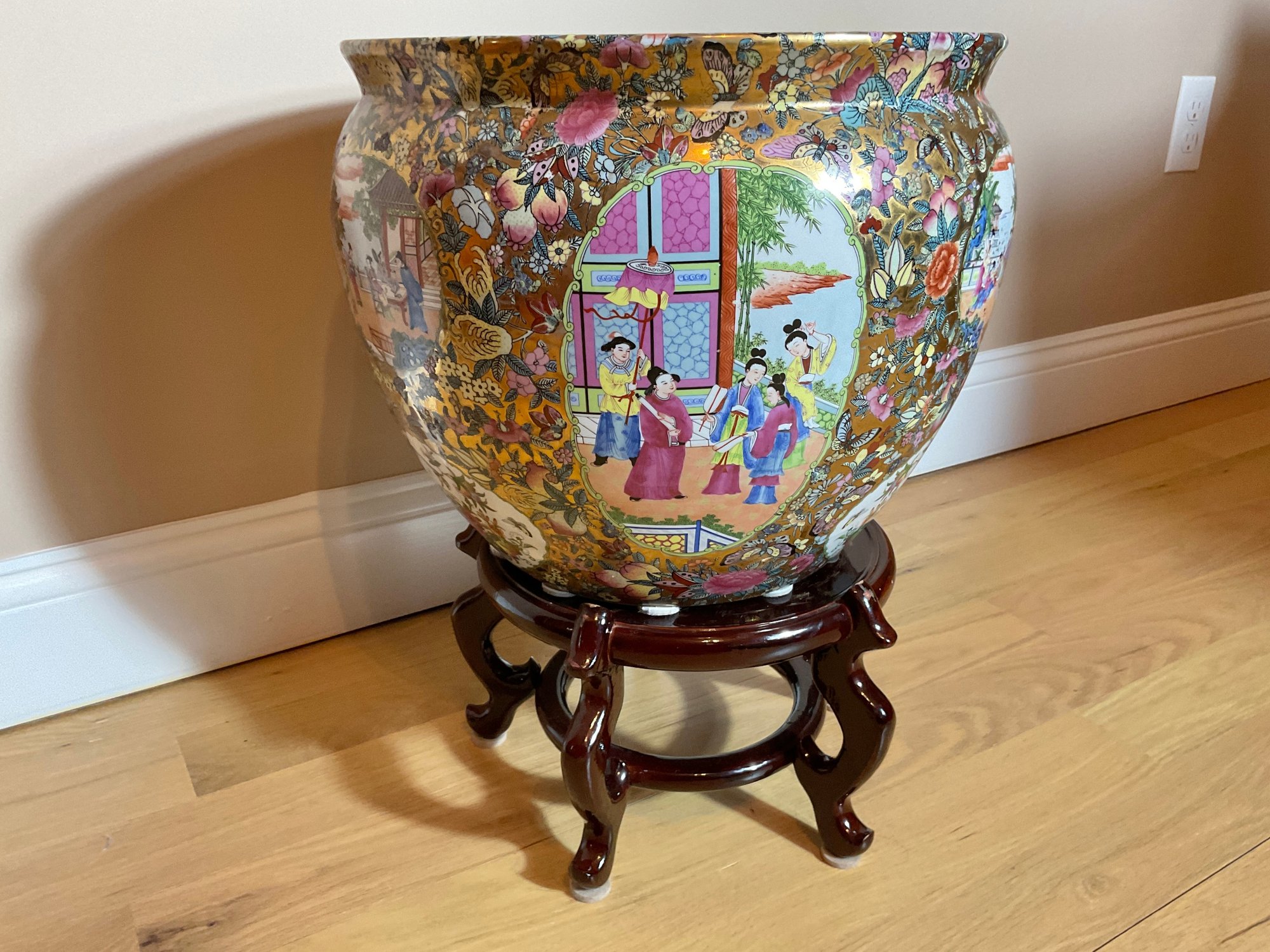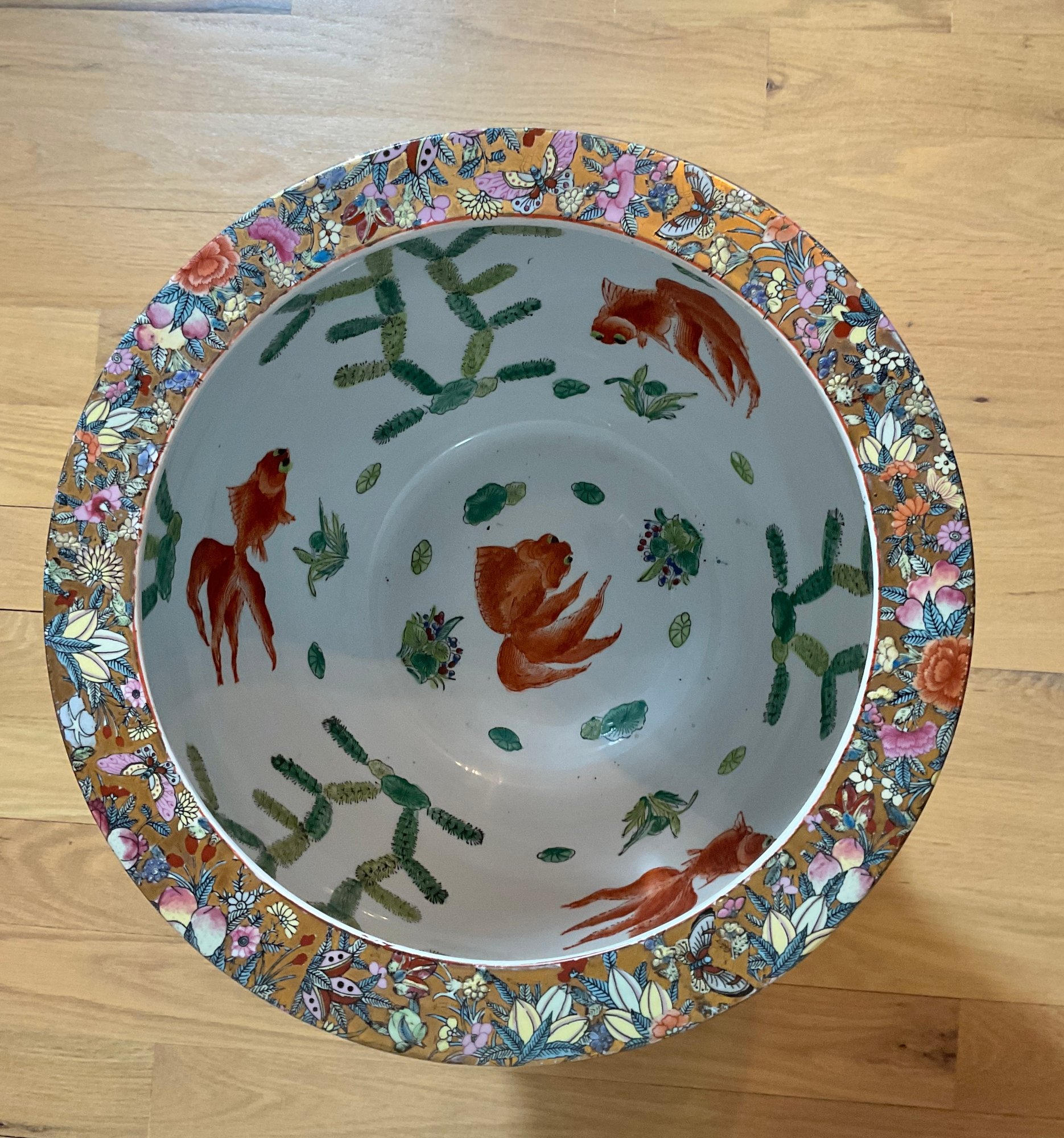 Porcelain koi fish bowl can also be used as a planter. All hand painted heavy porcelain wood stand is mahogany.
