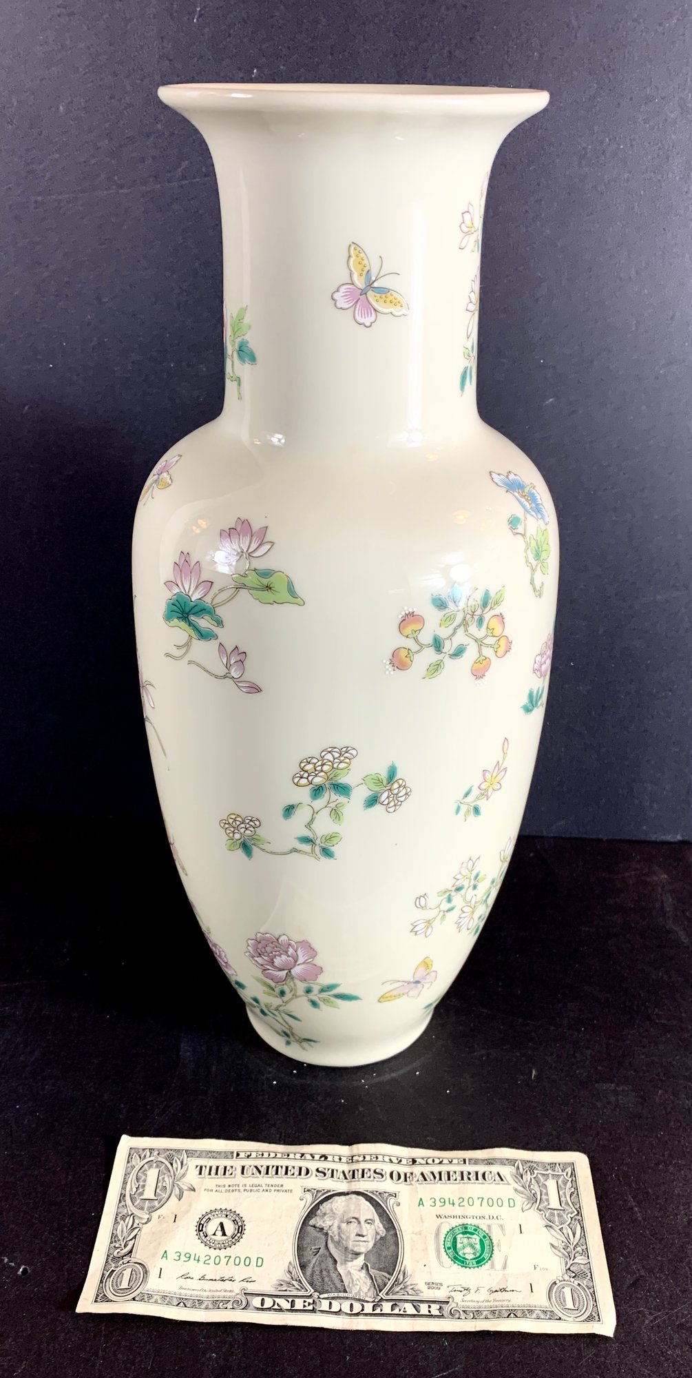 This vase is all handpainted, interesting decorations of chrysanthemums, peonies, berries, and assorted Asian flowers. Very nice quality.