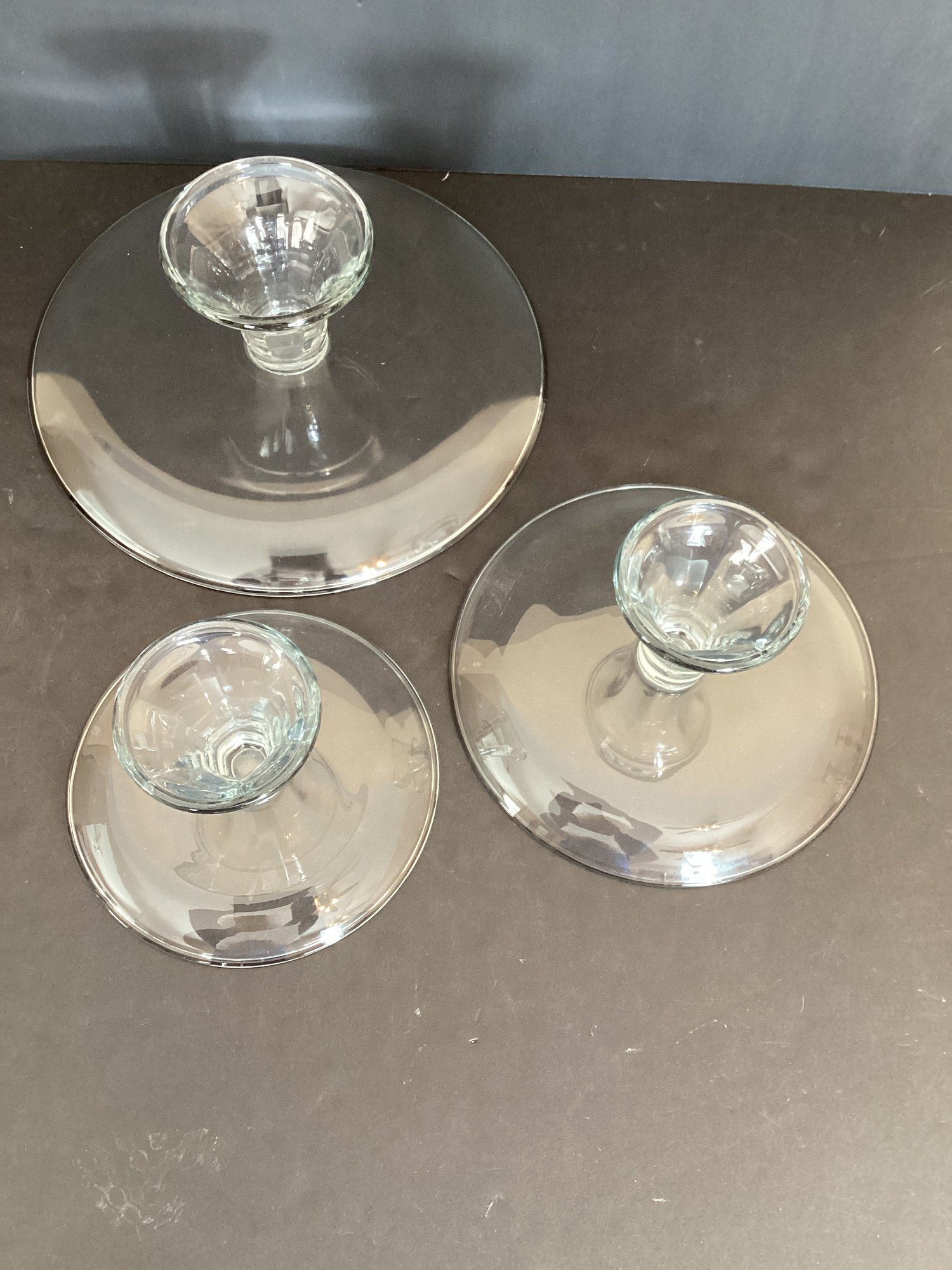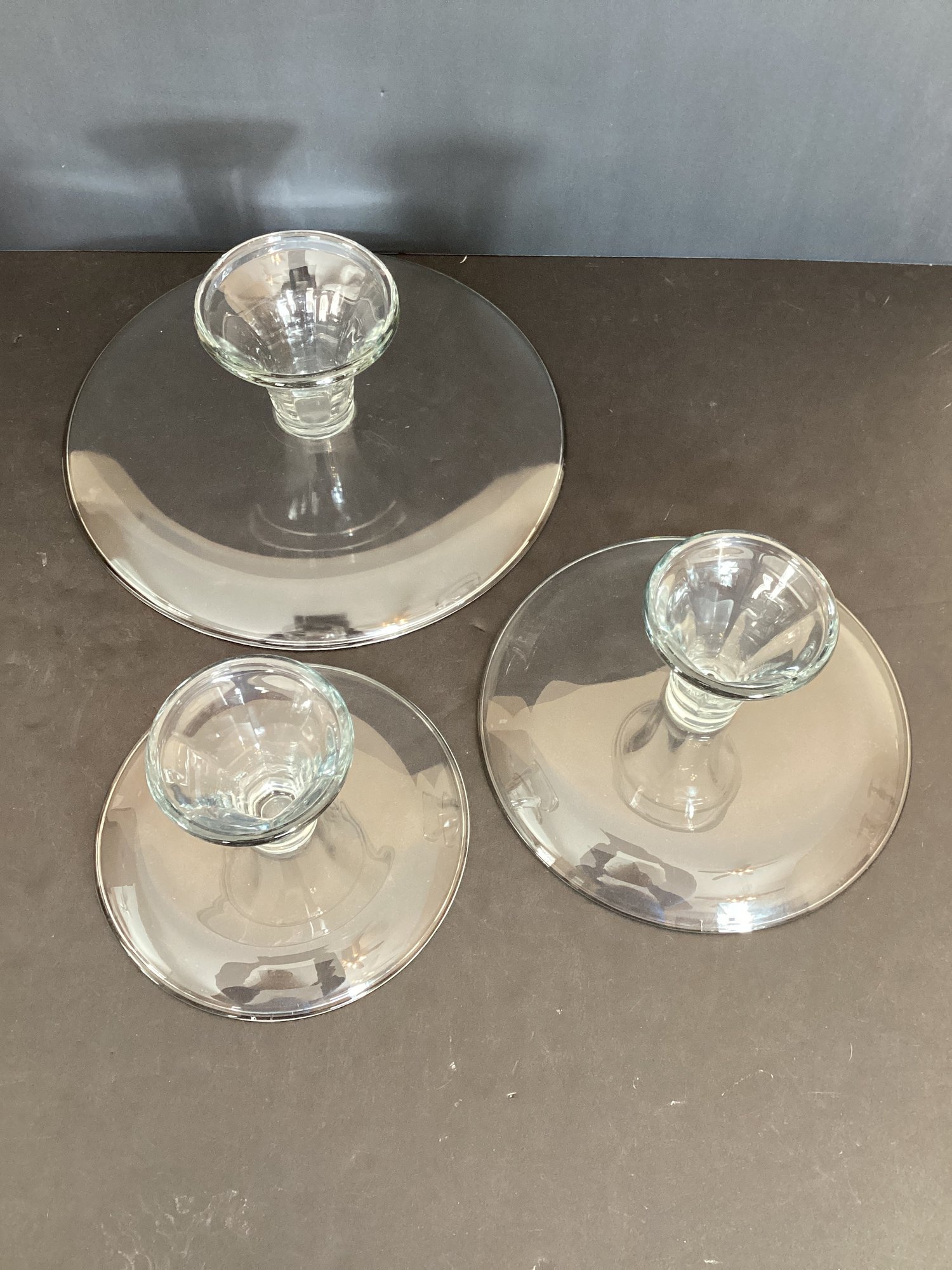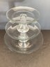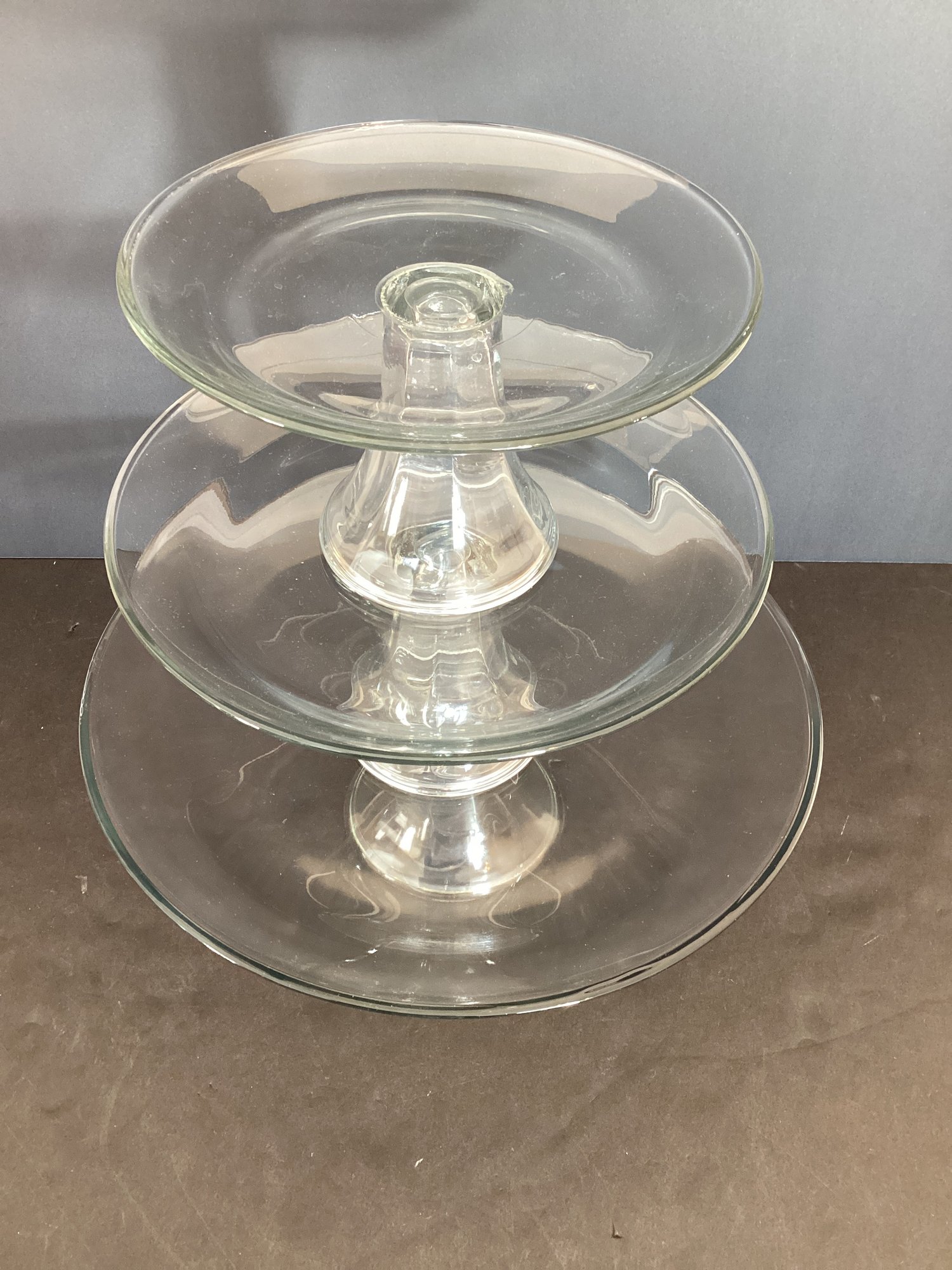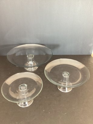 3 varied size pedestal cake plates in clear glass. Never used.