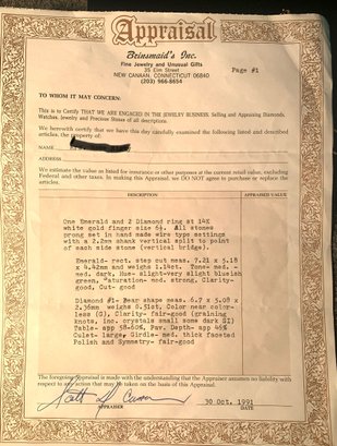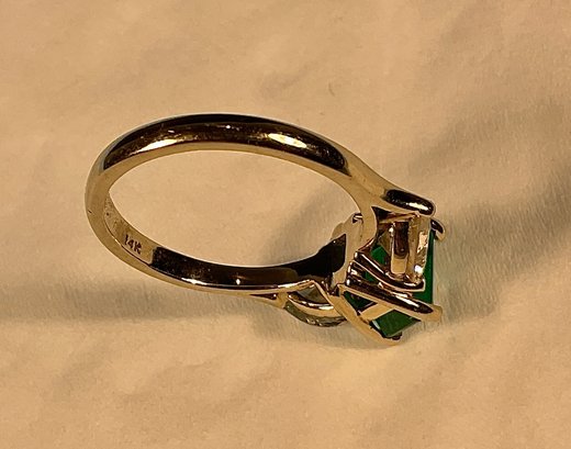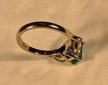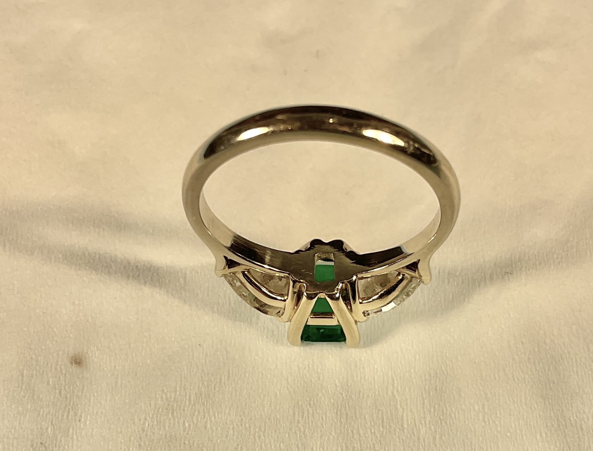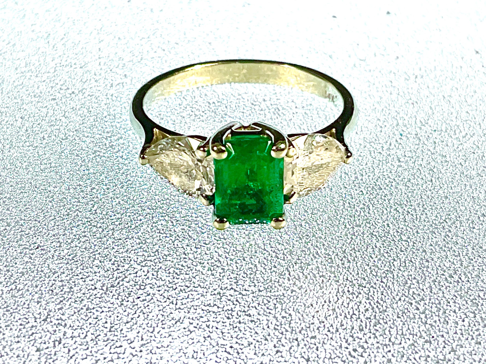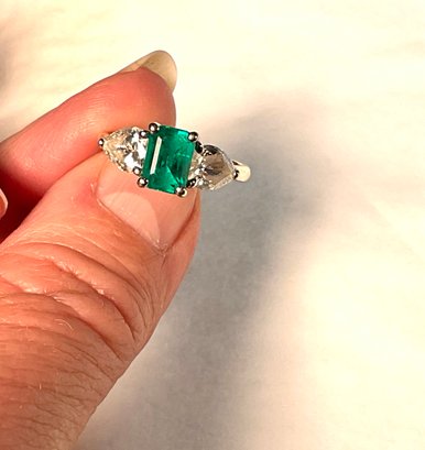 Size 6.5 14K Emeald & Diamond Ring. Set in white gold we have an Emerald weight 1.1 Ct. Flanked by two pear shaped diamonds.