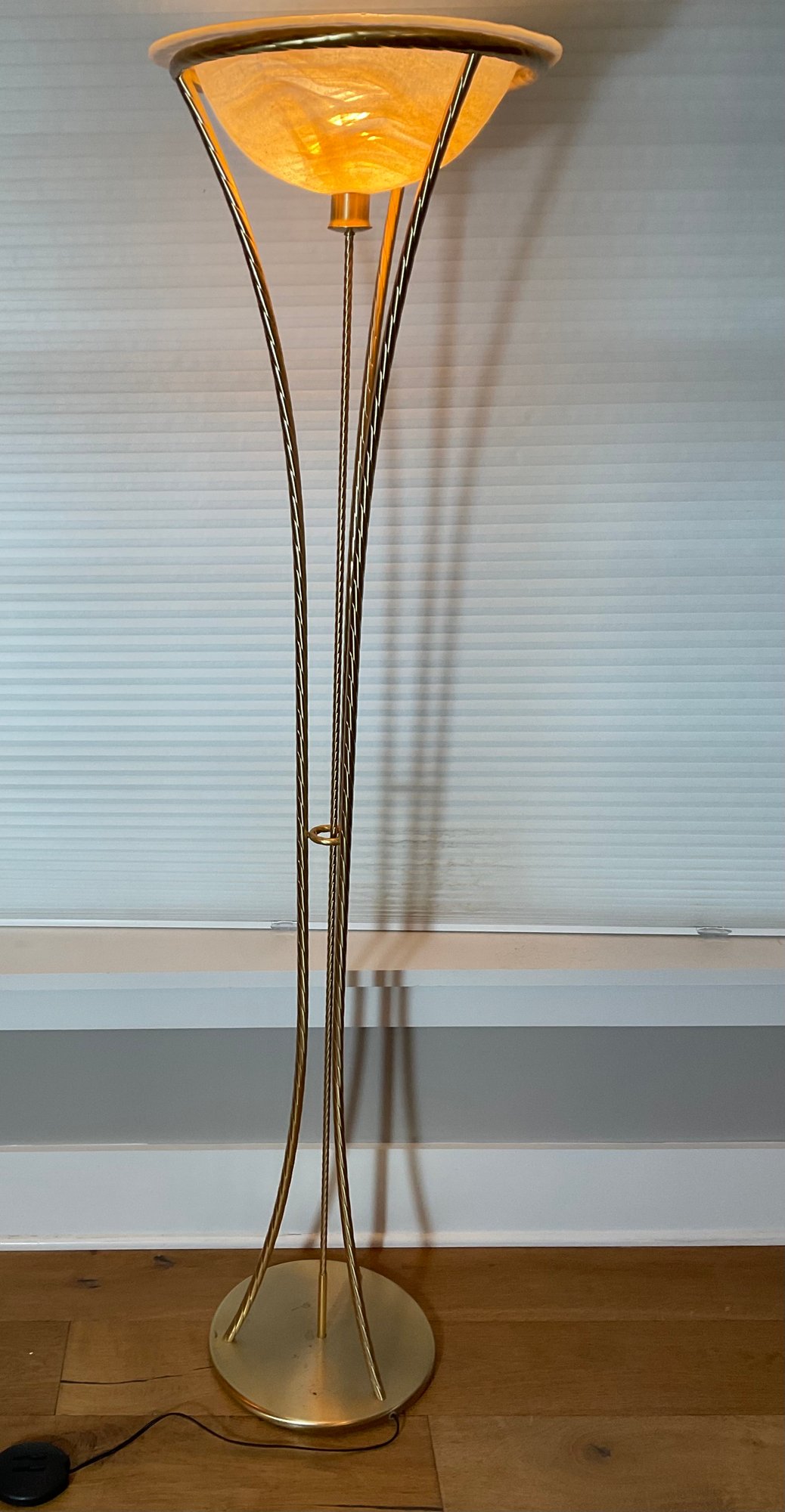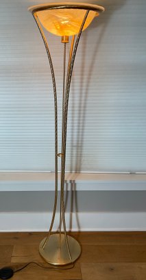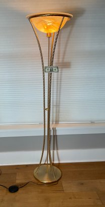 This is a very substantial, contemporary tripod floor lamp to share style, this lamp has a very nice art glass shade. Everything seems to be in good condition and has been used here for a few years.