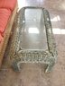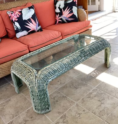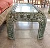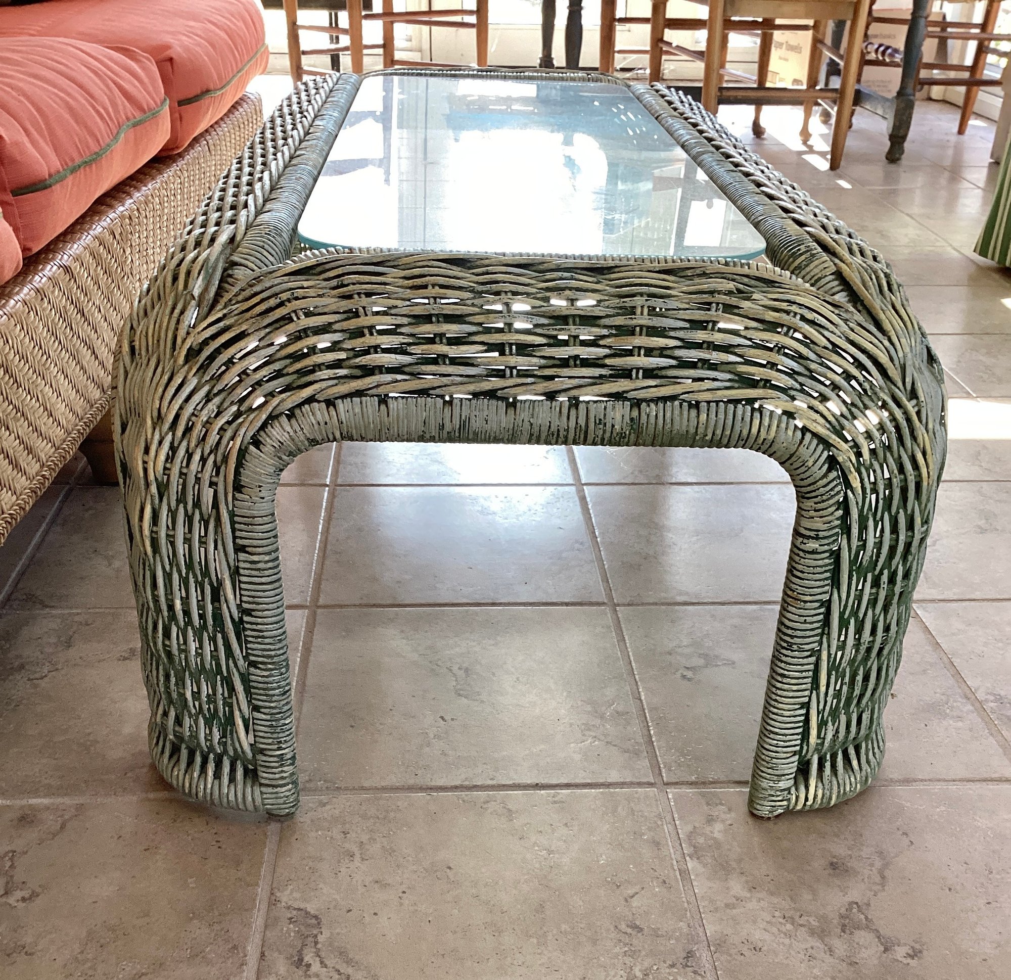 There is a very substantial, small but useful wicker coffee table with a glass top very sturdy ready to use. Interesting distressed paint.