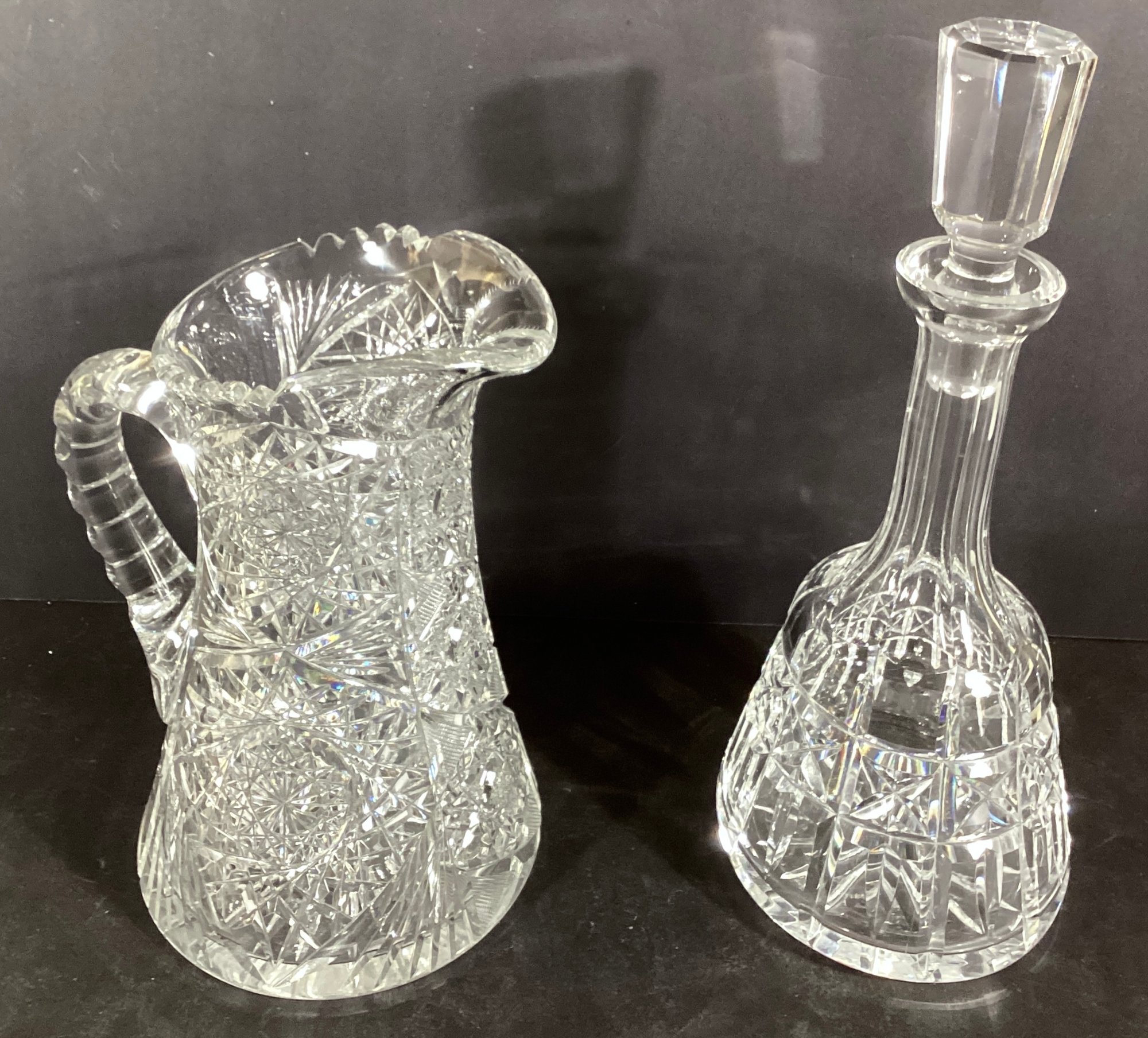 * The crystal pitcher has a starburst and pinwheel design and has a substantial weight. The diameter at the base of the pitcher is 6.00”, and height is 9.50” at its highest. (No manufacturer marking noted on this pitcher).