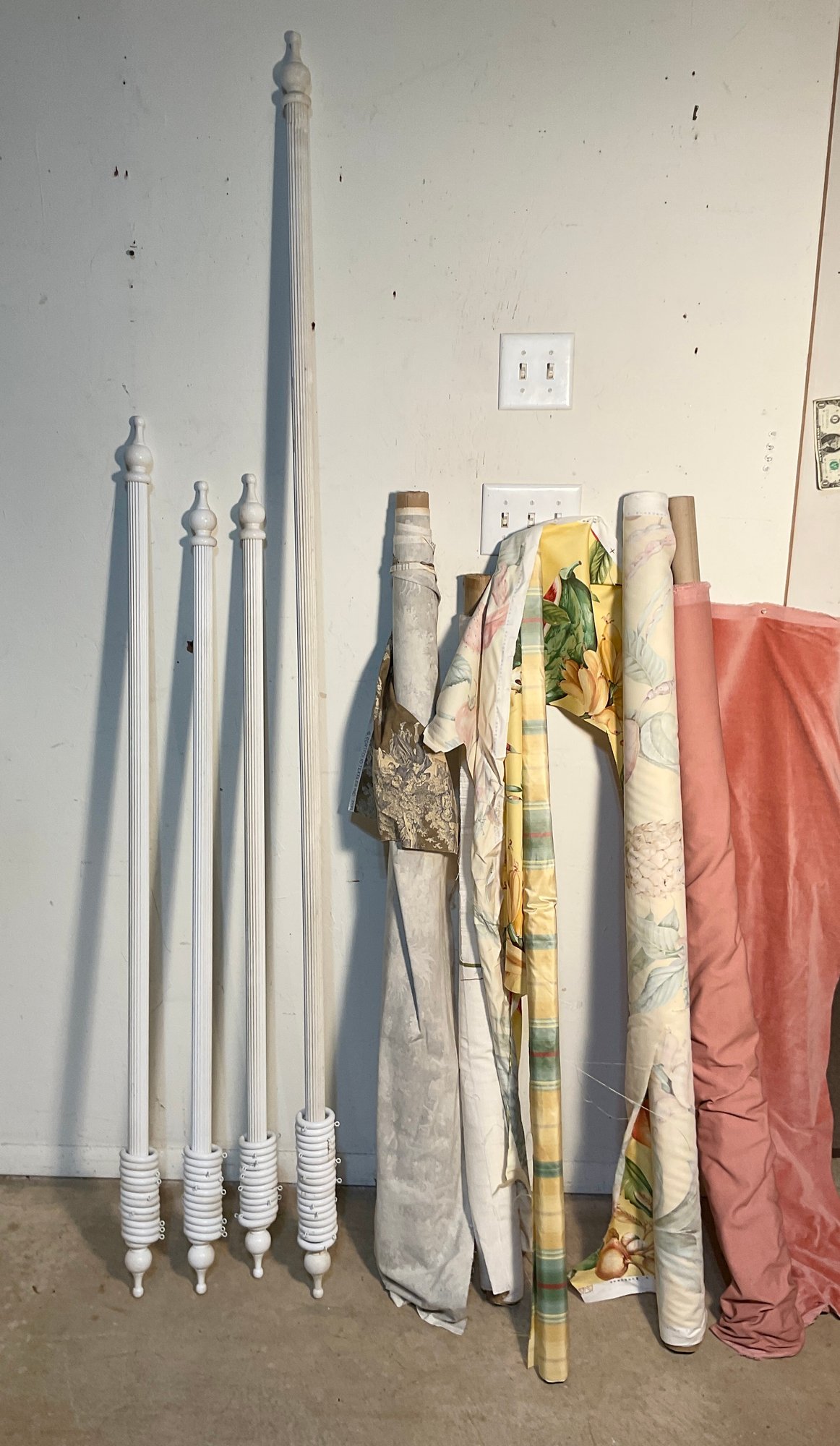 Assortment of drapery rods and fabric. High quality wood drapery rod SEE SIZES BELOW..