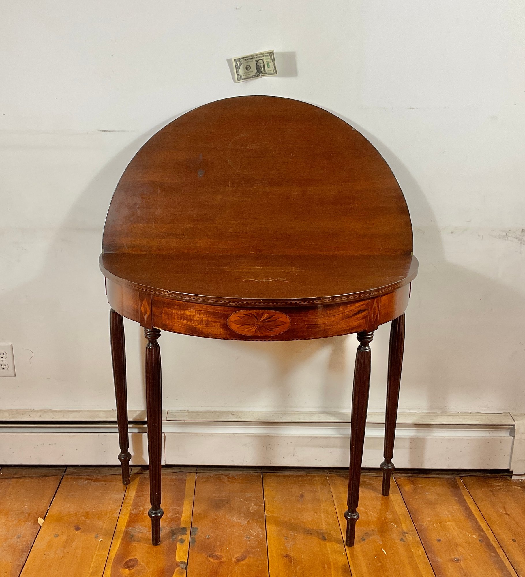 This is a very good quality solid mahogany Sheridan style game table. It has quite a bit of inlay and very delicate fluted tapered legs. A nice substantial table in good condition. Circa 1930s American.