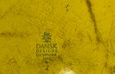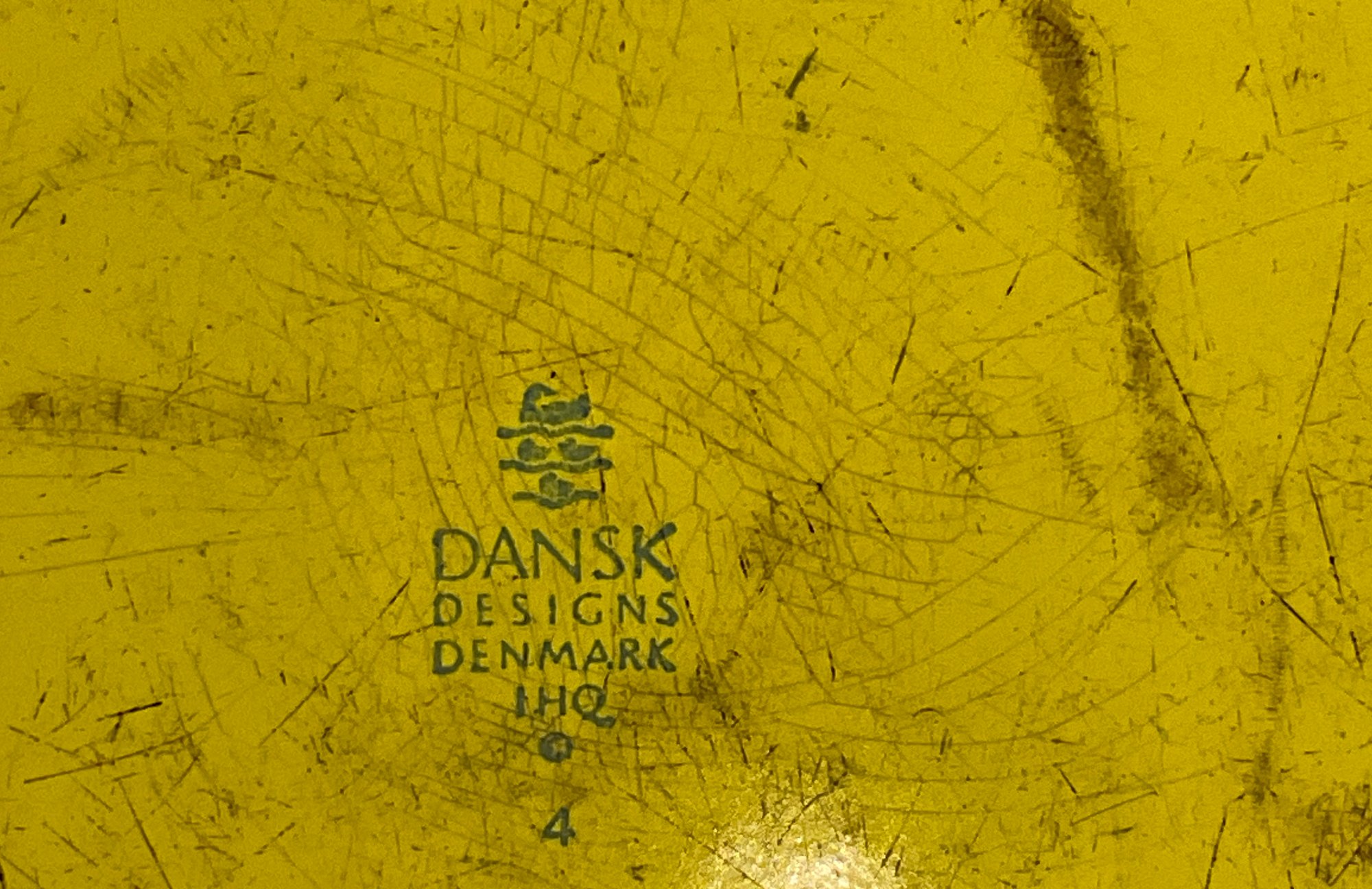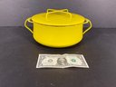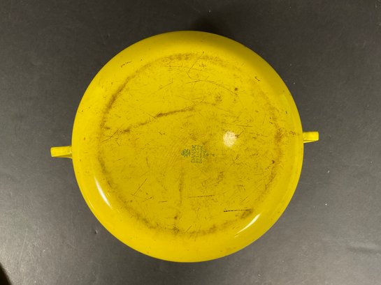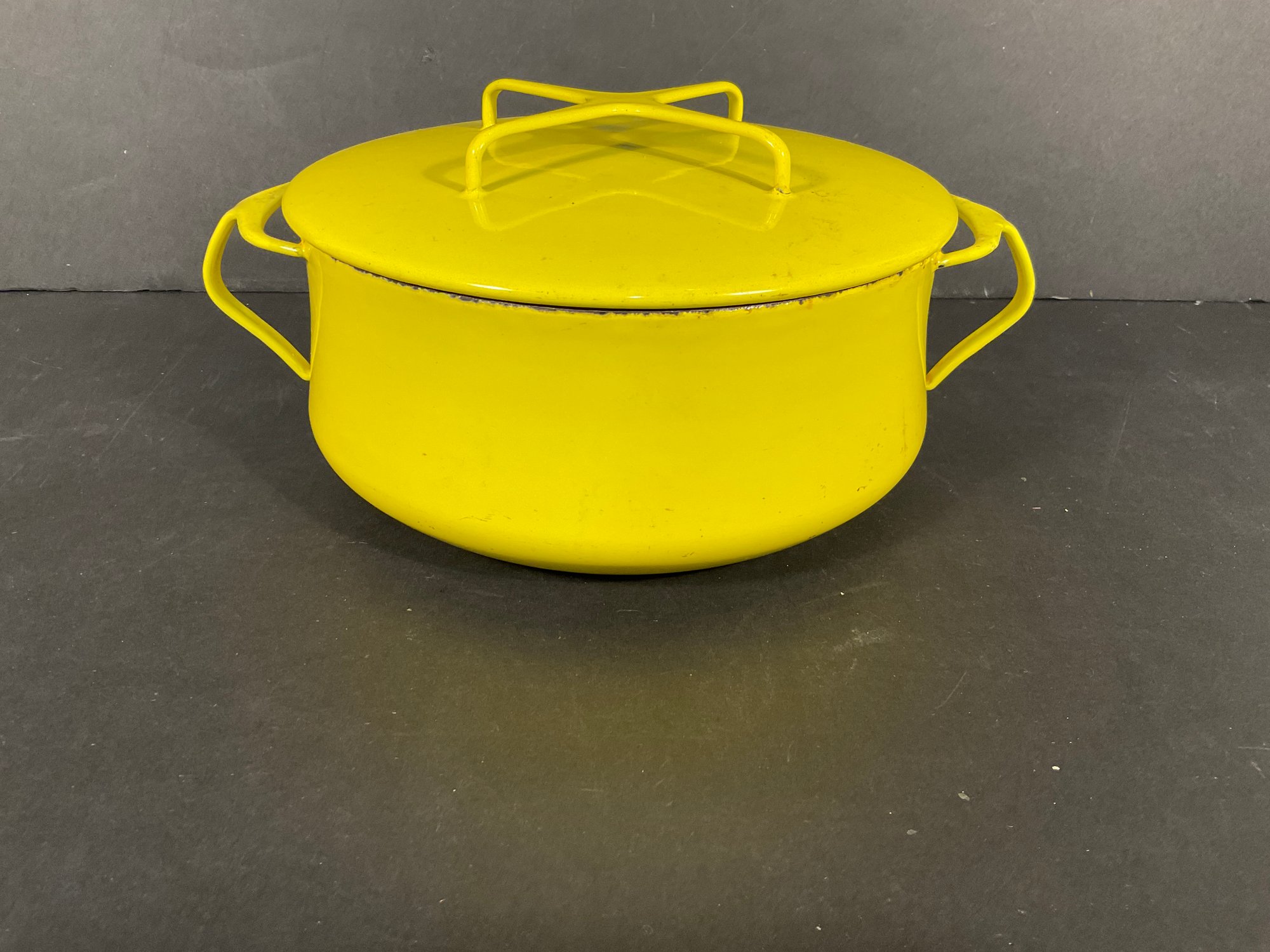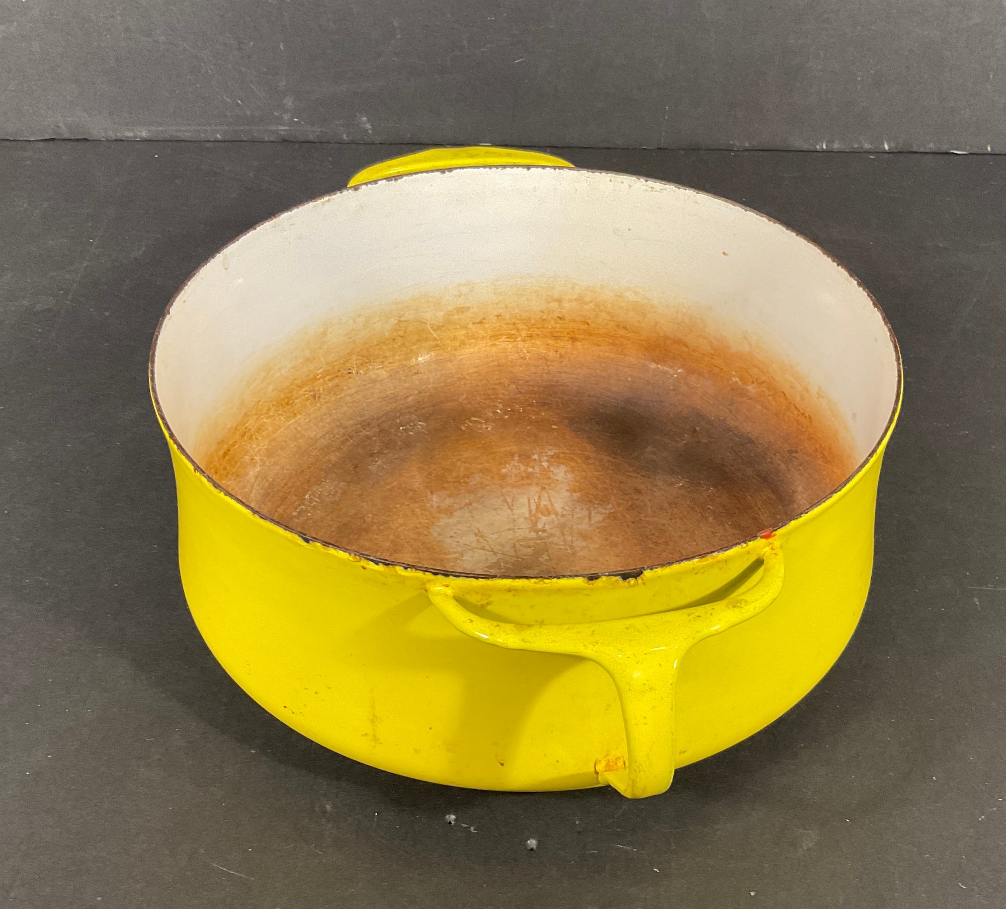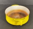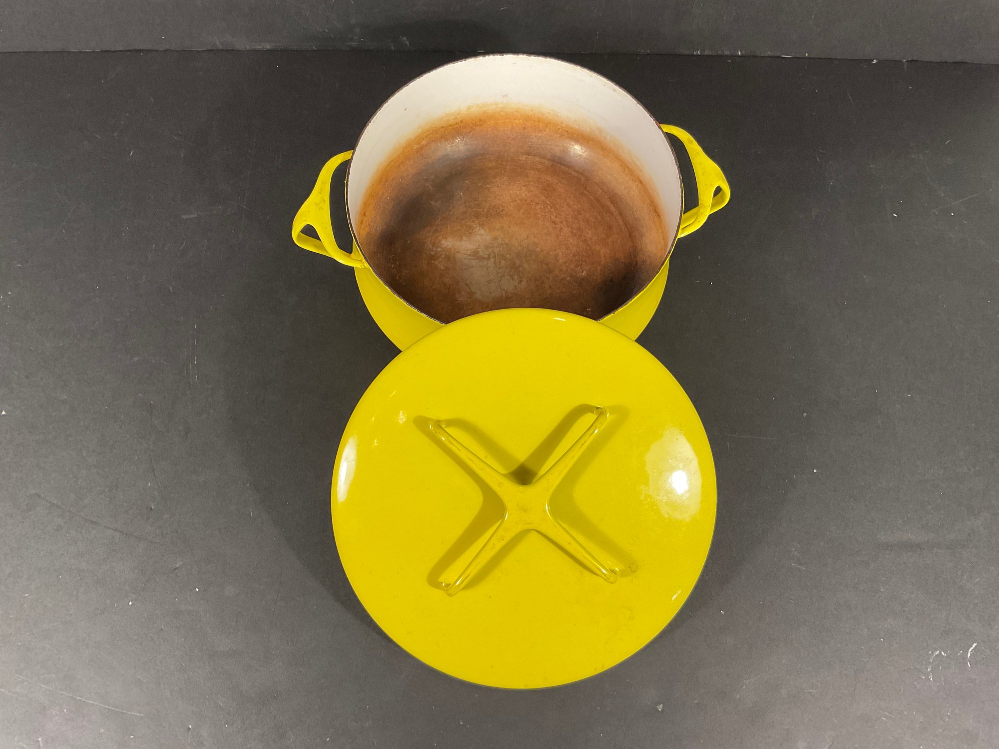 Bright yellow Kobenstyle style stock pot, interior staining can be removed with baking soda and vinegar, combination, age appropriate ware. Removed right out of the kitchen ready for you to clean and use. Great size. Made Denmark not Taiwan or Japan or China