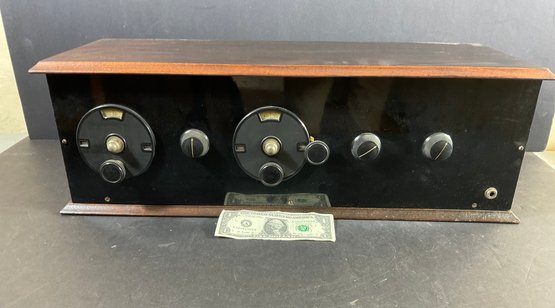 I cannot find any name on this radio. I’m told it comes under the heading of a superheterodyne. it appears to be fully restored. I am not a radio expert. All the tubes were wrapped up in paper that was dated 1968 see pictures. The case appears to be refinished at some point probably in the 1960s. I would say that it’s flawless. It’s untested. I’m going to assume it works.