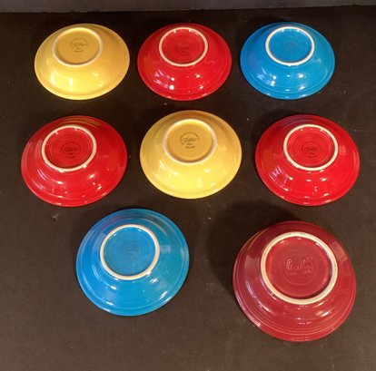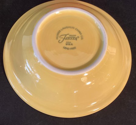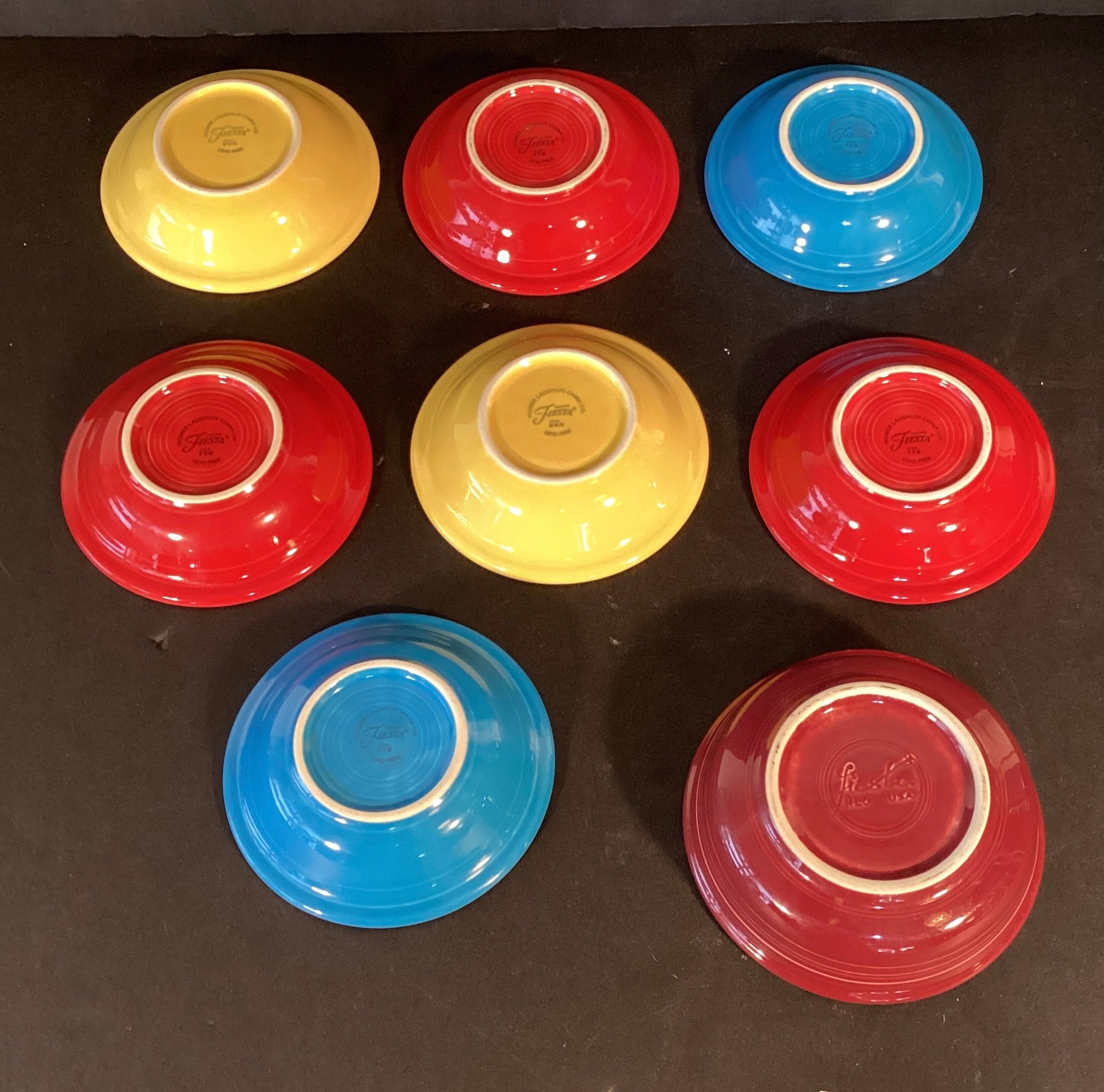 All are in very good condition and have the fiesta wear logo on the base of each. They’re all noted as lead free. The slightly larger bowl has the original fiesta wear logo, made in the United States on the base and the smaller serving dishes have the fiesta wear imprint.