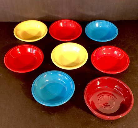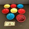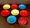 * there are also seven small shallow bowls that can be used for ice cream, sauces, or possibly such things as vegetable or fruit servings. There are two butter-yellow dishes, three cherry-red dishes, and two azure blue dishes. Each dish is approximately 1.5” in height and has a diameter of 5”.