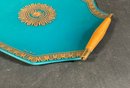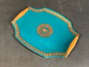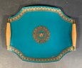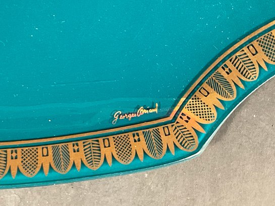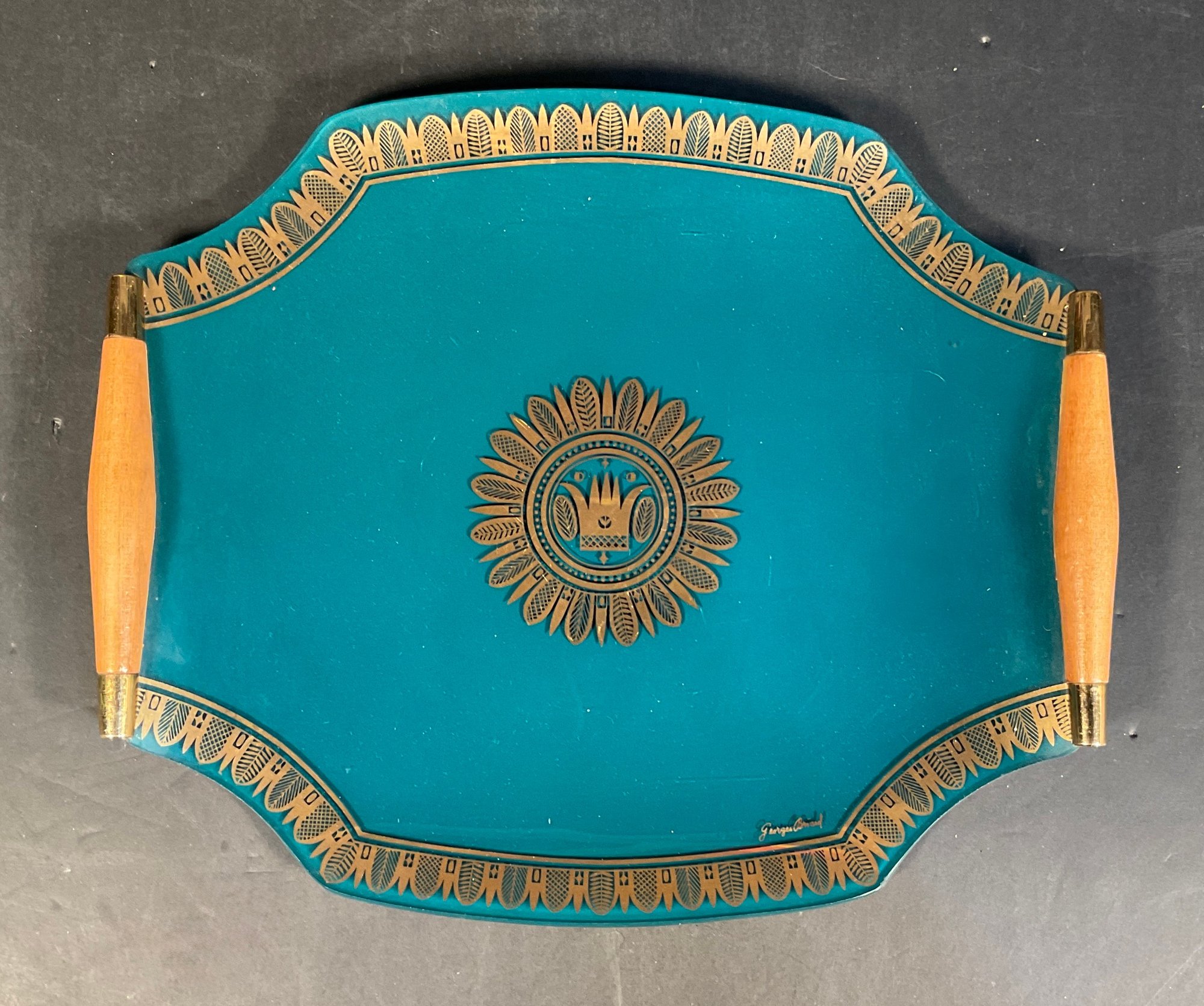 This item is a vintage Mid-Century Modern glass serving tray featuring a teal color with gold crown regalia accents and wooden handles, designed by Georges Briard.