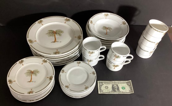 * 7 cups, 8 saucers, 8 salad/dessert plates, 8 soup shallow bowls, and 10 dinner plates. Sizes range with 6.00” saucers, 8.00” salad/dessert plates, 8.00” soup bowl, 10.00” dinner plates and cups with an approximate 4.00” diameter.