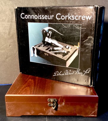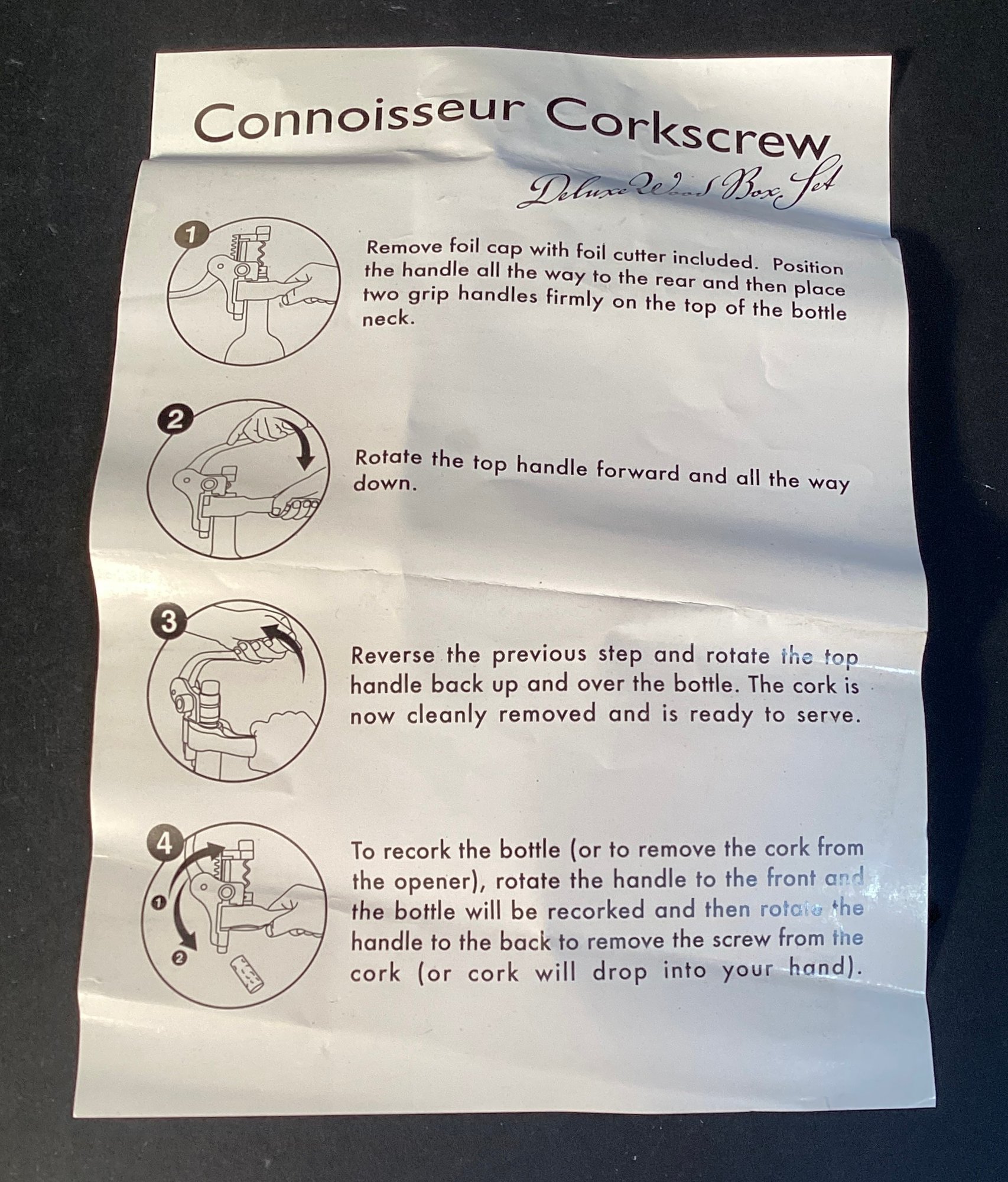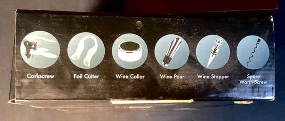 * six pieces include: corkscrew, foil cutter, wine collar, wine pour, wine stopper, an spare worm screw