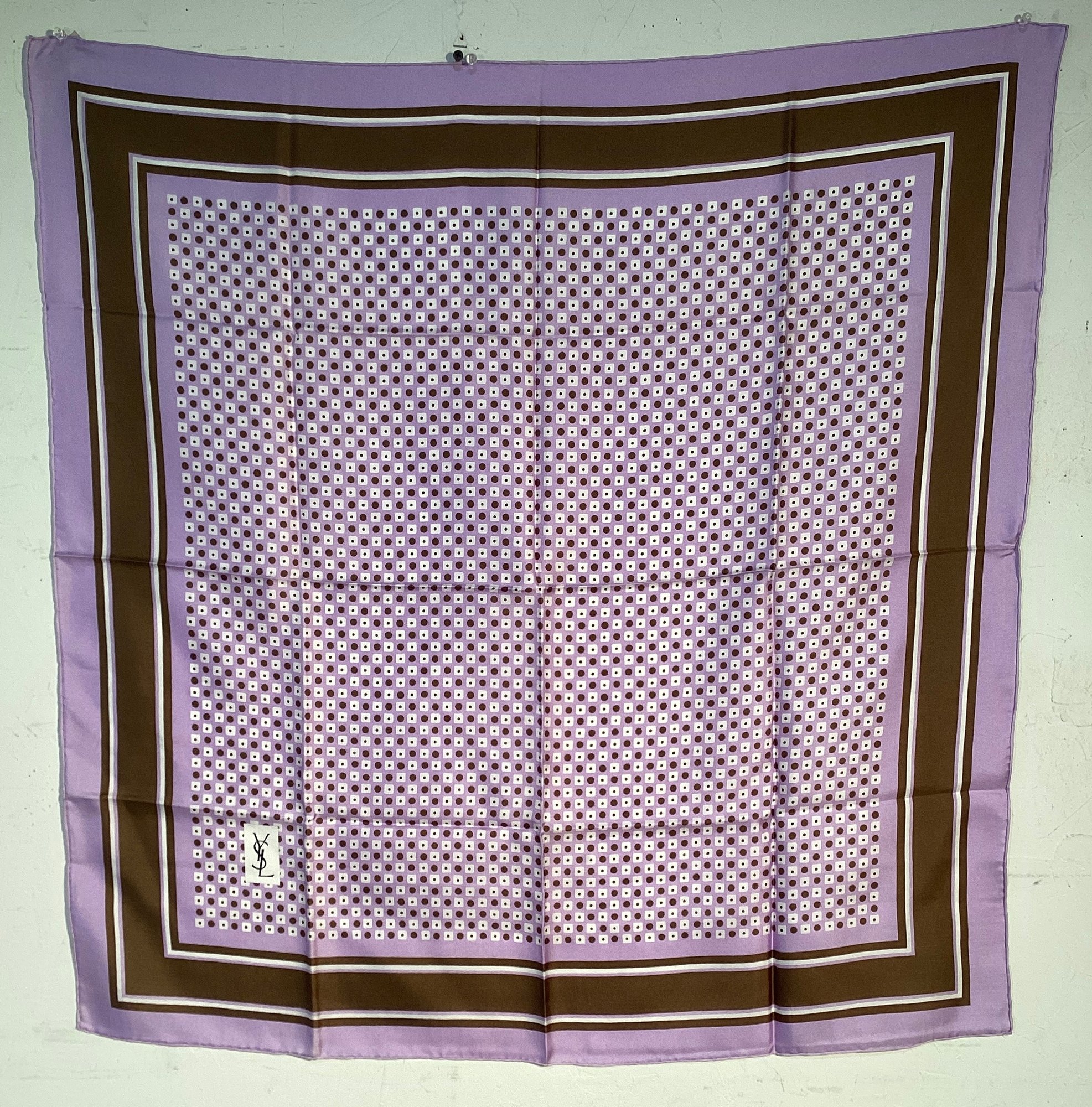 * the scarf has a light purple background with a repeating pattern of small white and brown squares.