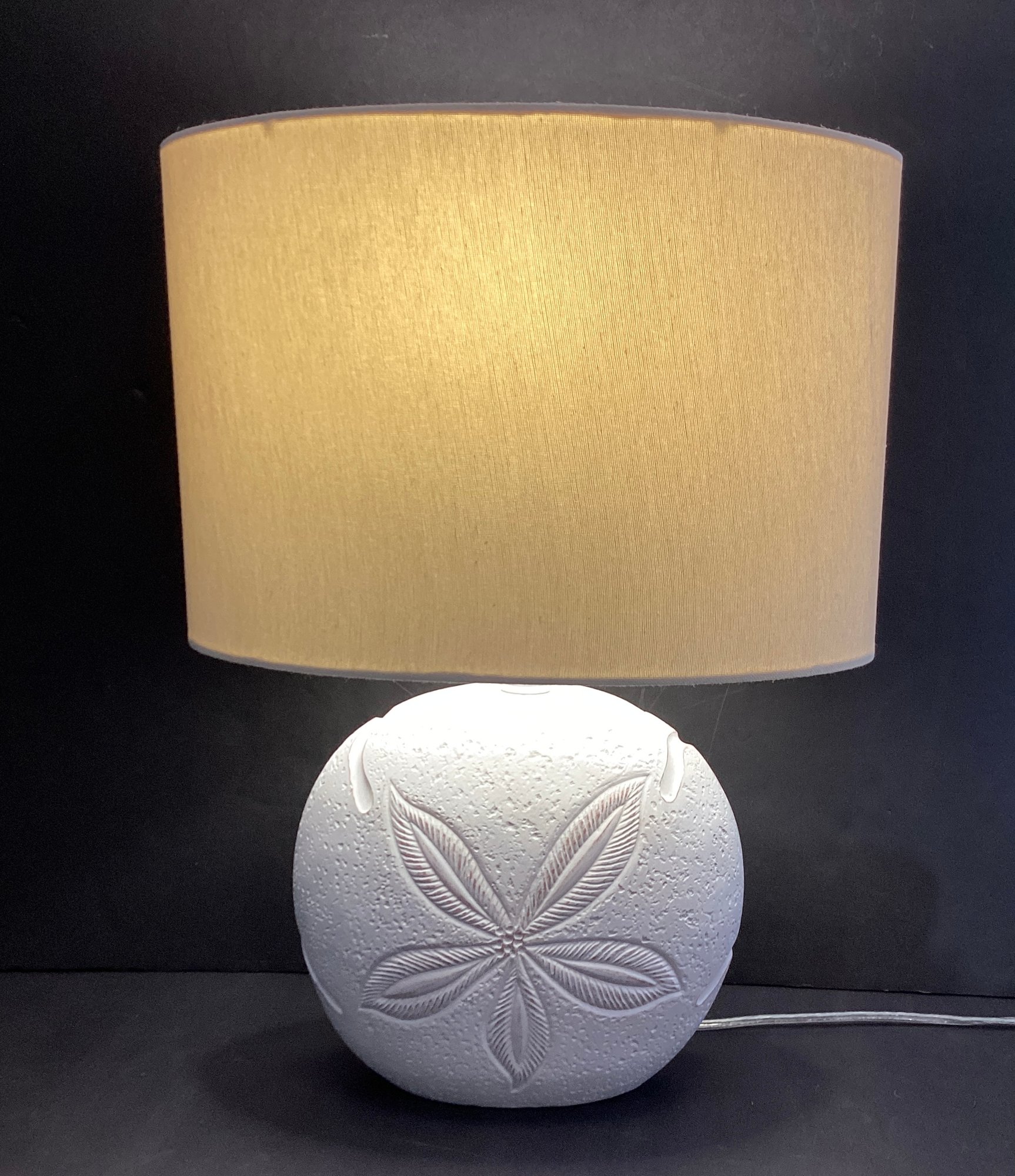 Here is another summer vibe lamp with accompanying lampshade for your home. This sweet lamp resembles the look of a large carved sand dollar on stone. This new lamp has been made with composite material and a white collar. The lampshade is made of white material and is shaped in an oval topped with a white ball finial.