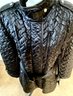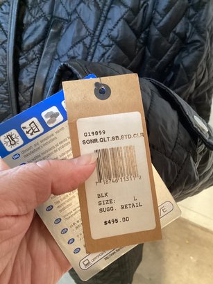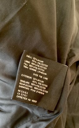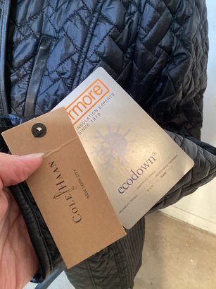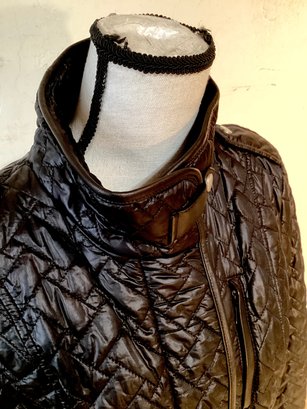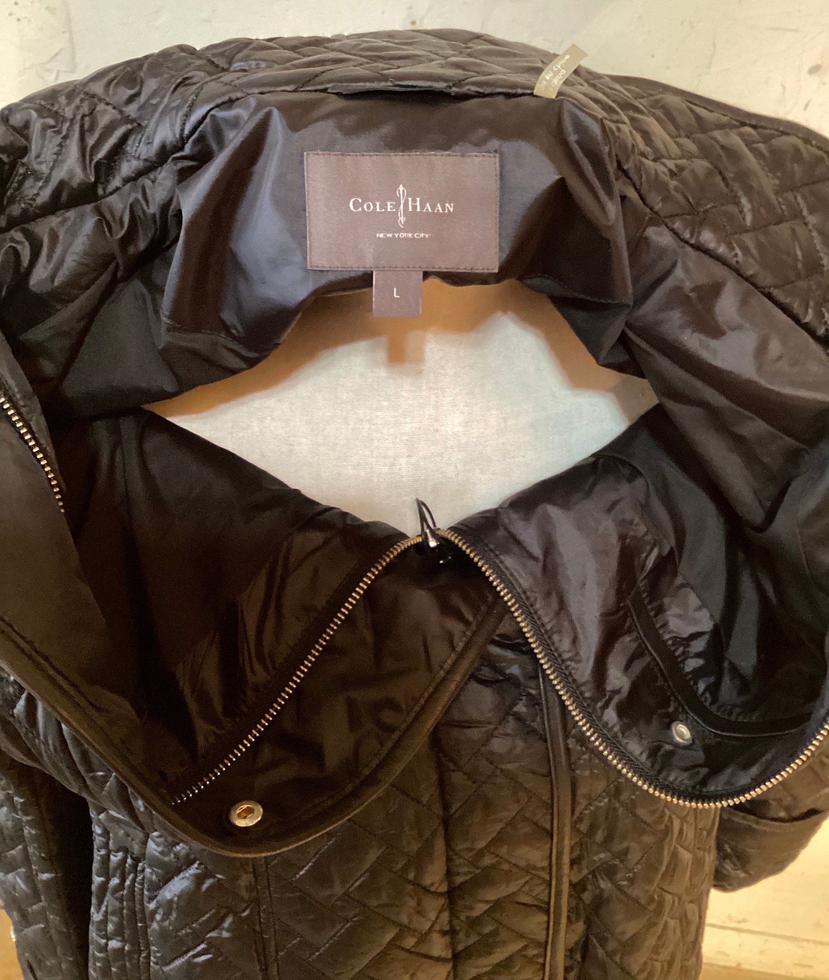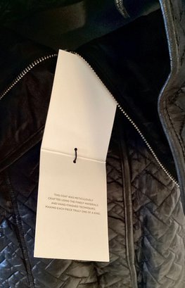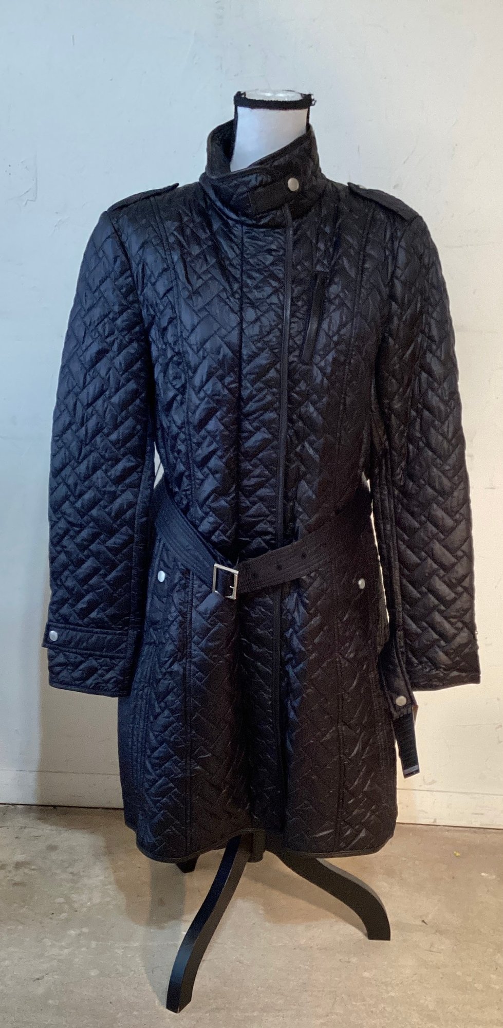 A new with tags quilted black car coat, belted with zipper and snap closures. Thin leather trim detailing.