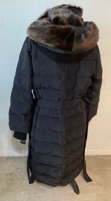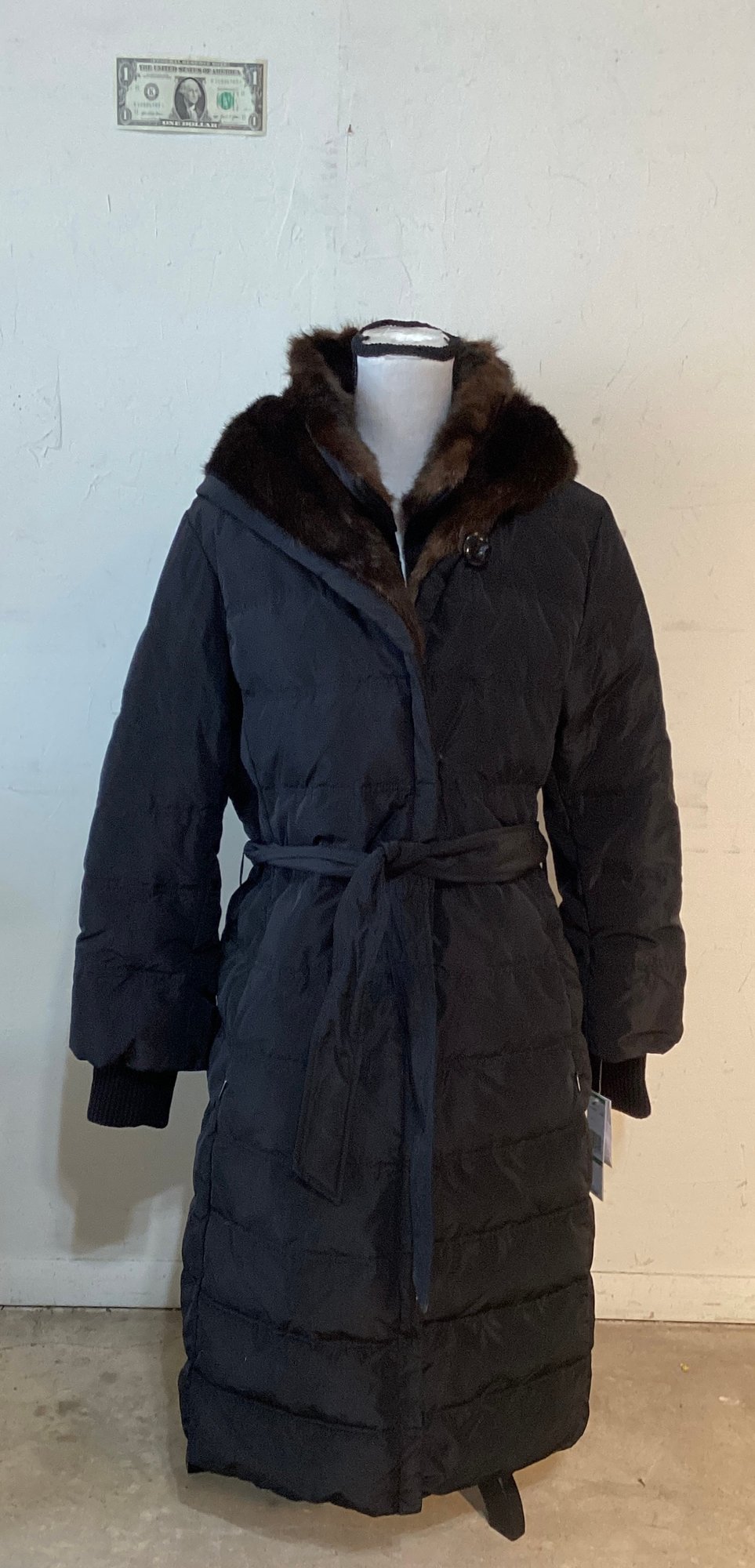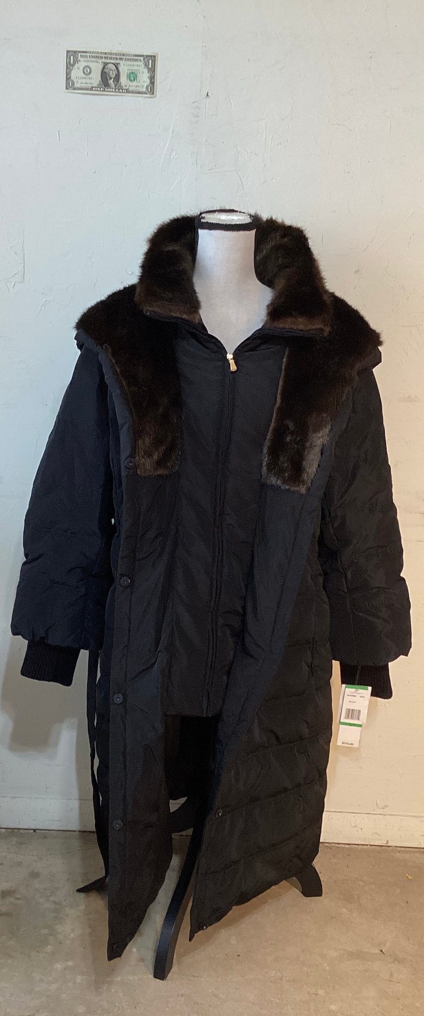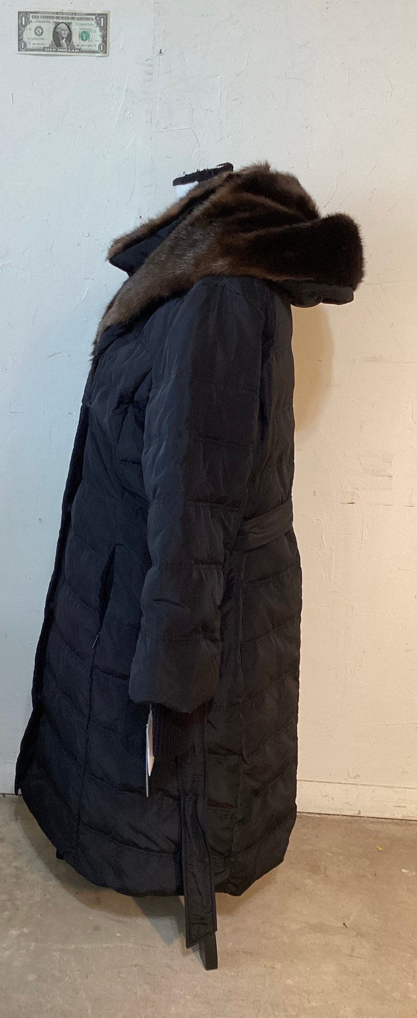 * zipper pockets and faux fur accents on coller and inner lining of hood.