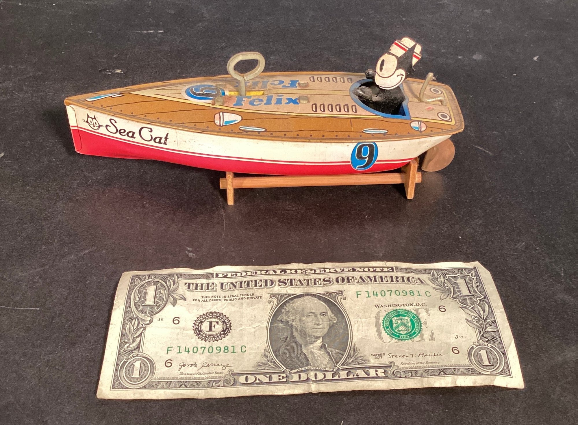 Here we have a 1996 Schylling collectors series of Felix the Cat wind up tin speedboat.