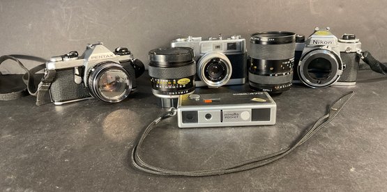 Vintage Nikon FE2 SLR 35mm camera body, Minolta AL-F circa 1970’s and a Pantax ASAHI ME both are 1970’s vintage. The last one is a Minolta Pocket 470 clean, They are functional and clean inside. Two have the original cases and lenses are clean. There are two lenses for 35mm cameras 54mm and a 28 mm lens they are not tested but look very clean Kept in a dresser drawer and used fairly recently.