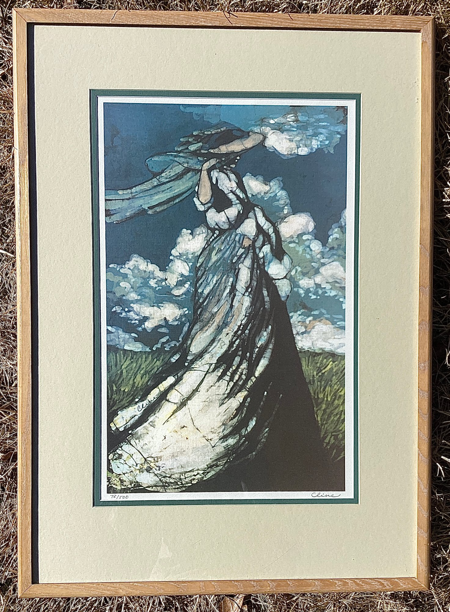 This numbered print is double matted with the inner mat being a deep teal green, & the outer mat evoking the color of warm sand. This is under glass, and has a natural wood frame.
