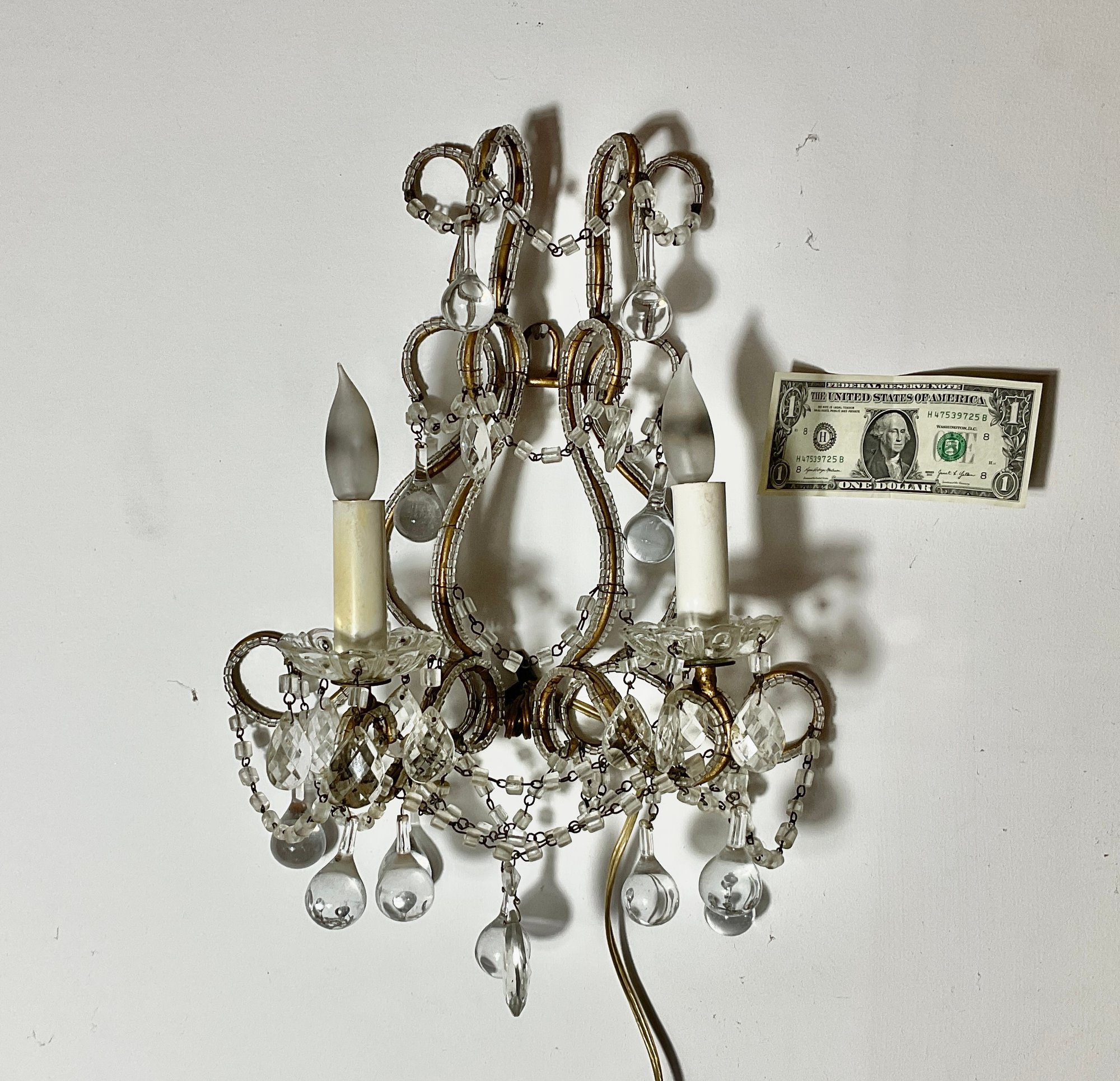 here’s a nice delicate French style vintage crystal sconce. It appears to be complete and will work nicely. Just hang it on your wall.