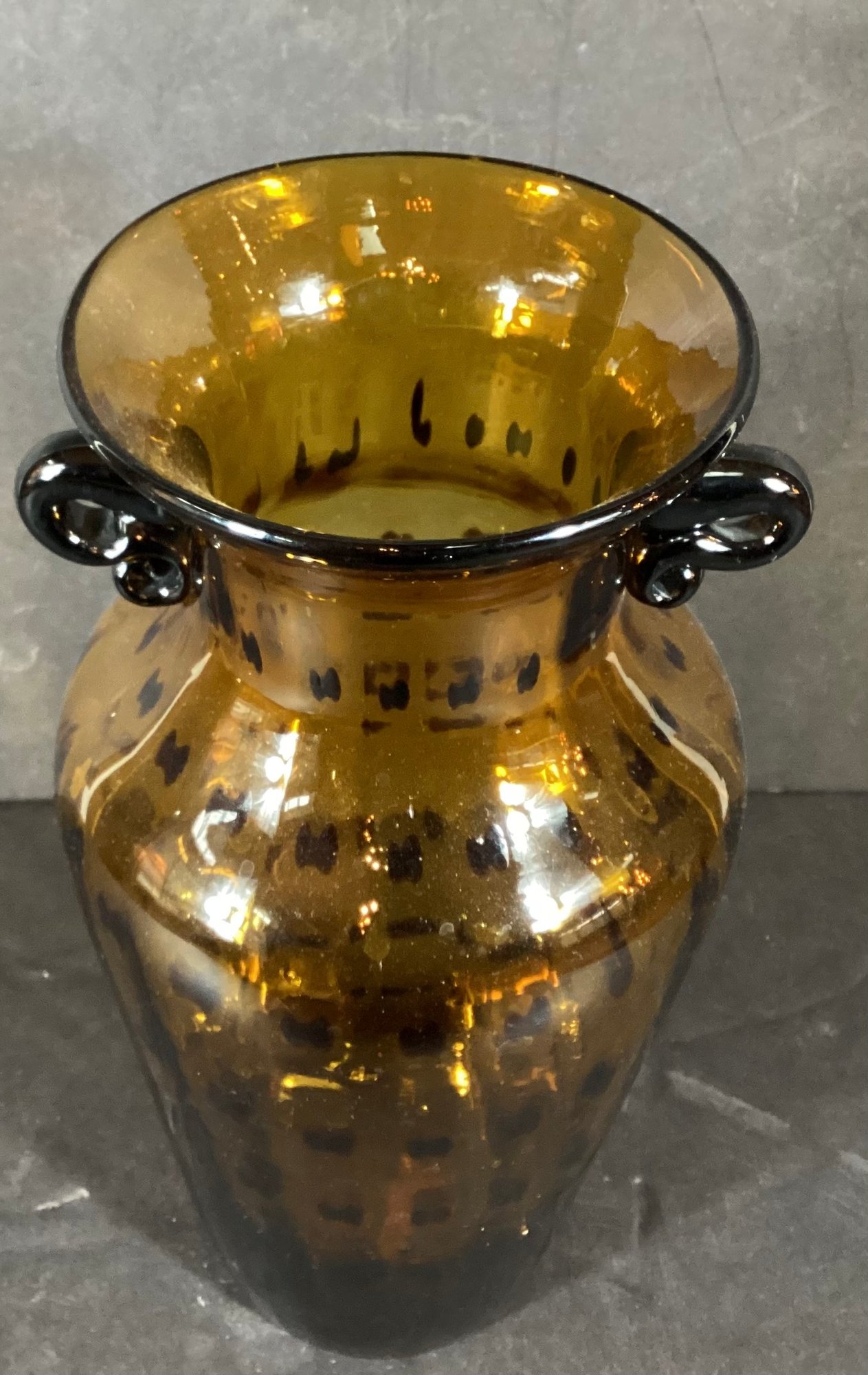 Here we have a beautiful hand blown glass vase with decorative handles.