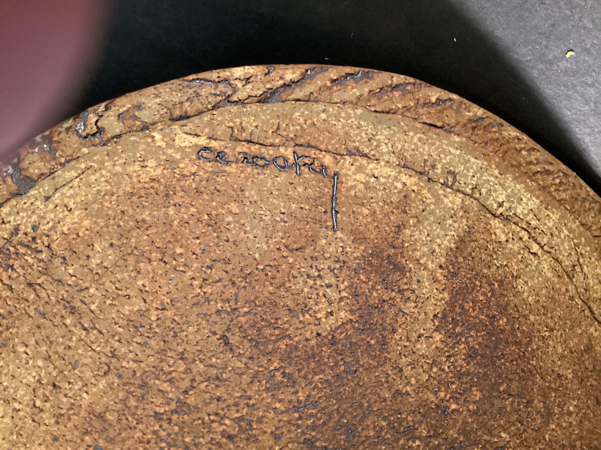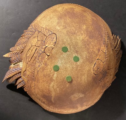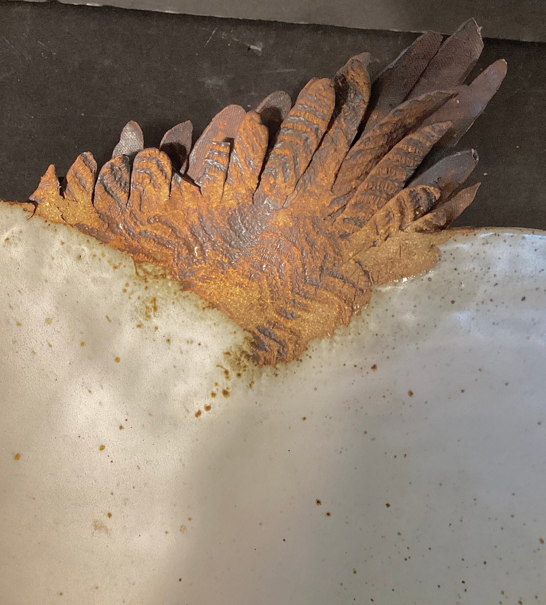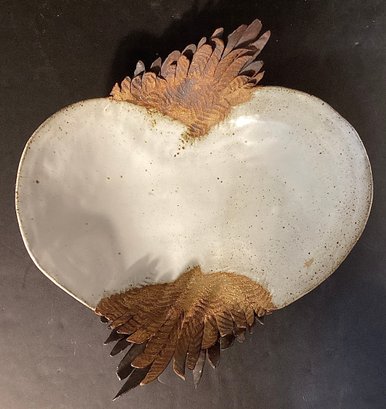 This is a very substantial art bowl that has has a low sheen glaze in ivory tone with the ‘feathers’ in the original toned clay.
